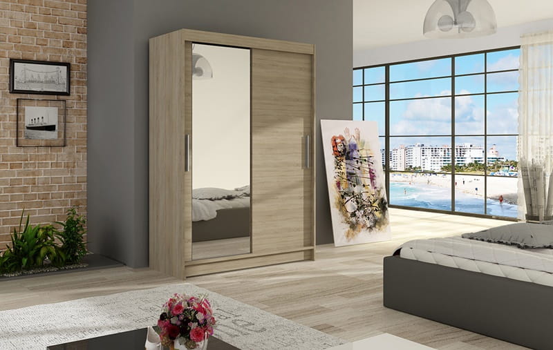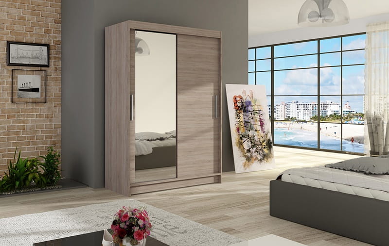 W przypadku szafy KIAMI VI zastosowano standardowe ułożenie lustra zajmującego front jednych z przesuwnych drzwi. Wybór strony zależy od gustu użytkowników, istnieje możliwość montażu po prawej lub lewej stronie. Lustro świetnie współgra ze smukłymi, srebrnymi uchwytami umożliwiającymi komfortowe otwieranie oraz zamykanie mebla. Wnętrze cechuje się przemyślanym ułożeniem drążka oraz półek, przystosowanych do przechowywania garderoby również długości i wielkości. Niewielkie rozmiary sprawiają prezentowany model sprawdzi się małych pomieszczeniach takich jak przedpokój.