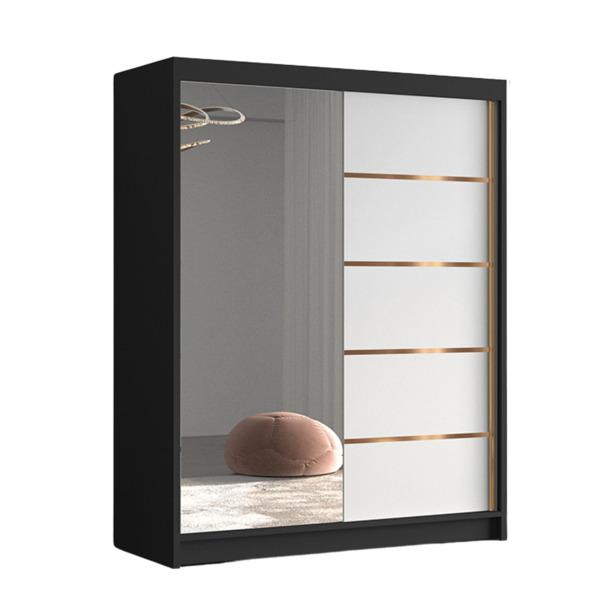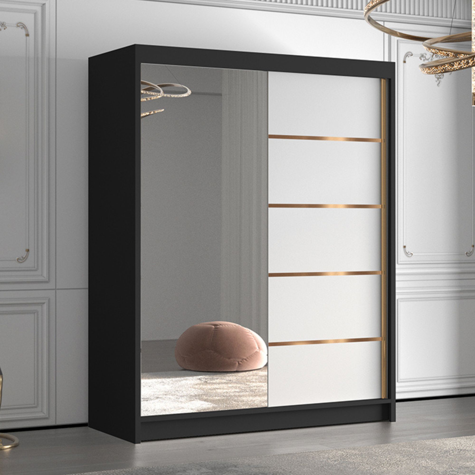 Solidna konstrukcja, wysokiej jakości materiały oraz dbałość o detale to cechy wyróżniające model FLAVI. Czarny korpus mebla jest trwały i odporny na codzienne użytkowanie. Złote akcenty wprowadzają do przestrzeni nutę luksusu bez nadmiernej ekstrawagancji. Szafa FLAVI to przemyślany wybór, który łączy nowoczesną estetykę z codzienną funkcjonalnością.