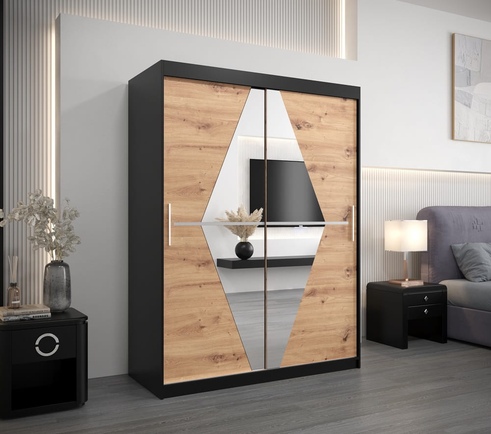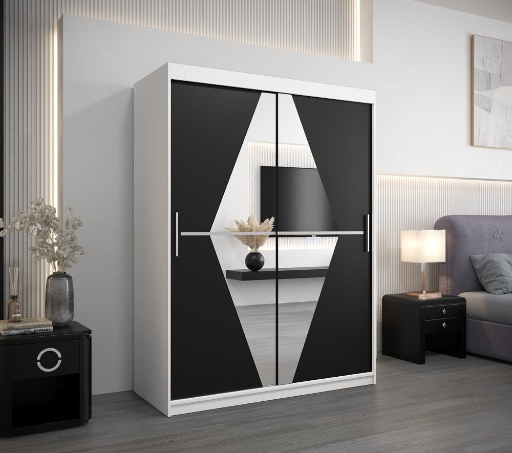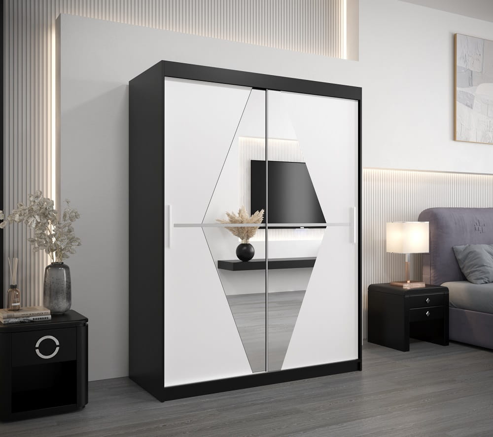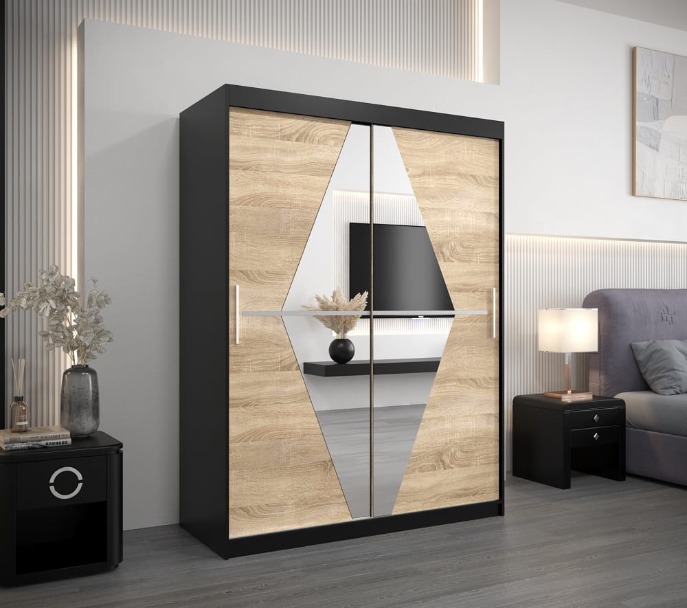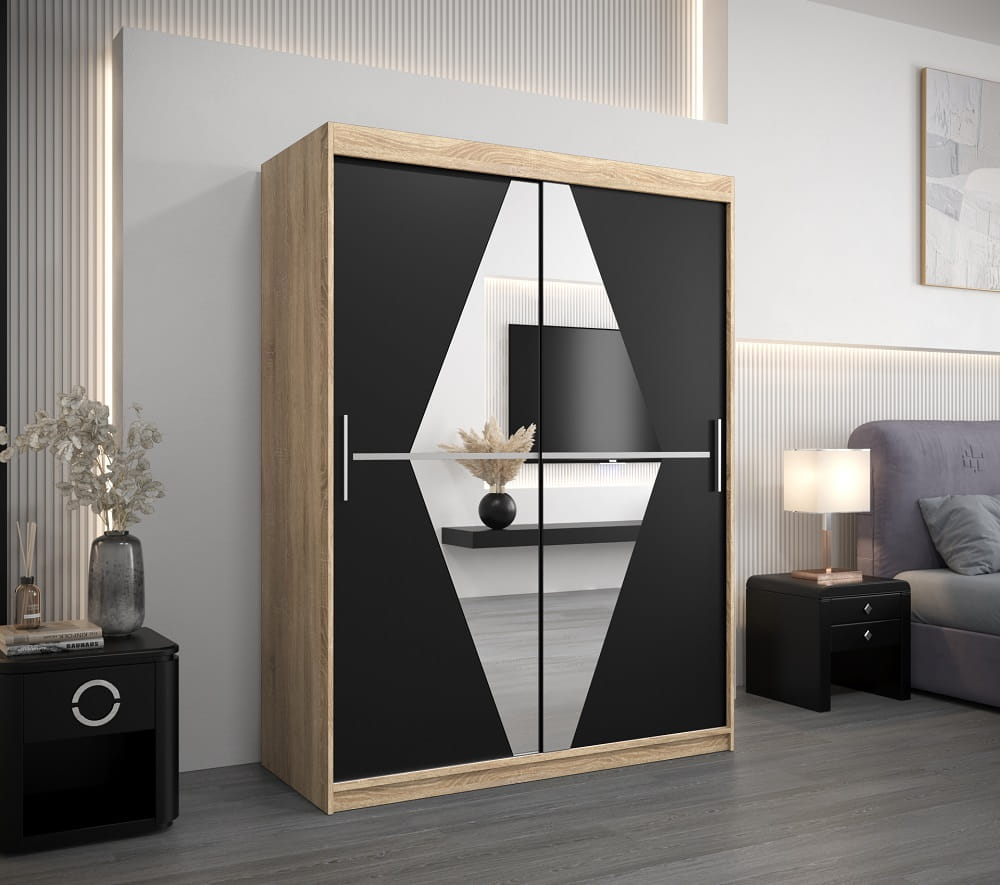 Szafa przesuwna 150 cm BOLIVIO została wykonana z dbałością o najdrobniejsze szczegóły. Na funkcjonalnych i pojemnych półkach ułożysz przedmioty codziennego użytku, a dwa poziomy drążków do wieszania ubrań pozwolą pomieścić sporą ilość garderoby.