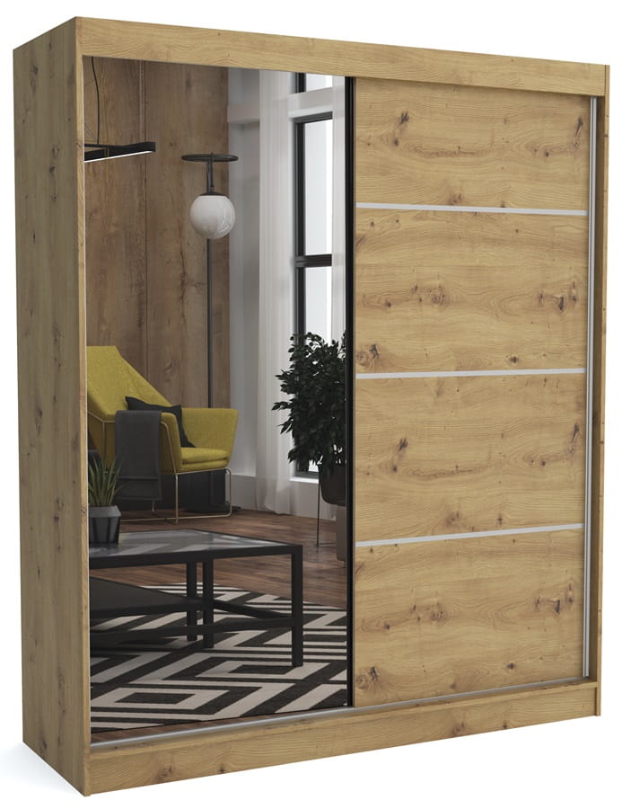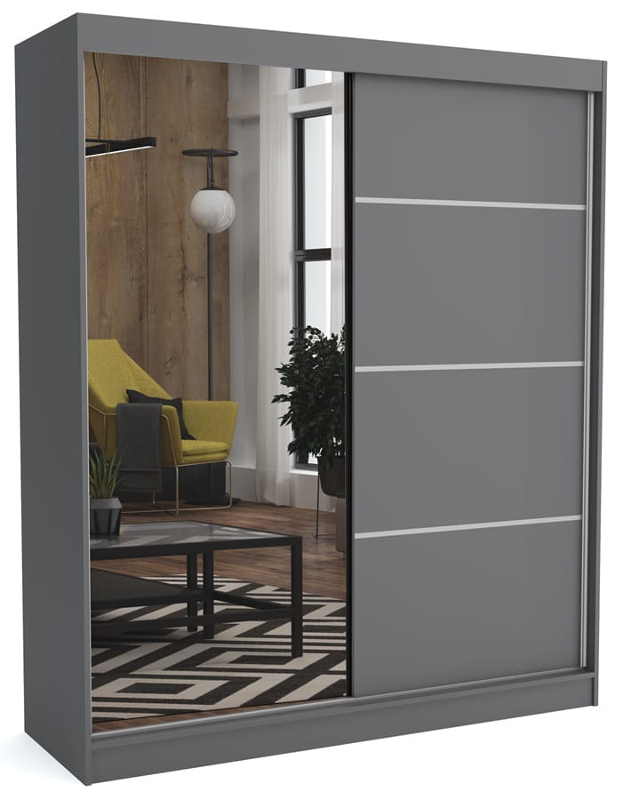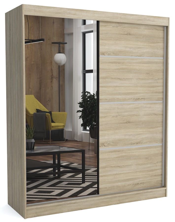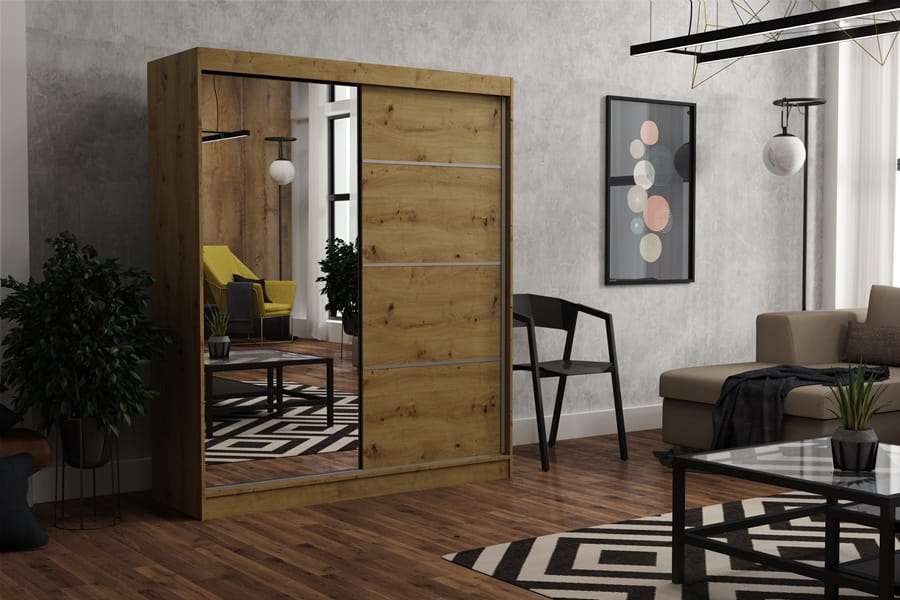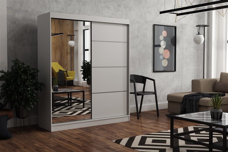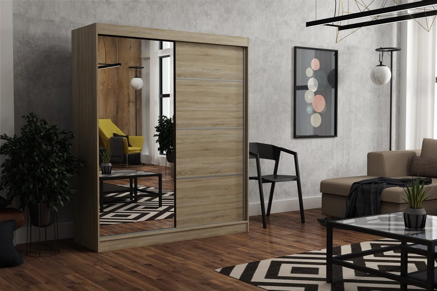 Elegancka szafa JERY 180 cm z pewnością pomieści ubrania nie tylko jednej osoby, ale całej rodziny. Mebel, dzięki swoim prostym kształtom oraz przemyślanej konstrukcji idealnie sprawdzi się w minimalistycznej sypialni czy nowoczesnym przedpokoju. Lustro przyklejone na jednym z frontów rozświetli każde pomieszczenie, a przesuwne drzwi ułatwią dostęp do wszystkich przedmiotów znajdujących się w szafie. Dzięki możliwości domówienia dodatkowego wyposażenia szafy, będą Państwo mogli dowolnie skonfigurować wnętrze mebla do swoich potrzeb. Wysokojakościowy system jezdny usprawni korzystanie z produktu, a mnogość półek ułatwi segregację poskładanych ubrań. Szafę wykonano z płyty laminowanej o grubości 16mm, a obrzeża wzmocniono odporną na uszkodzenia mechaniczne okleiną ABS.
