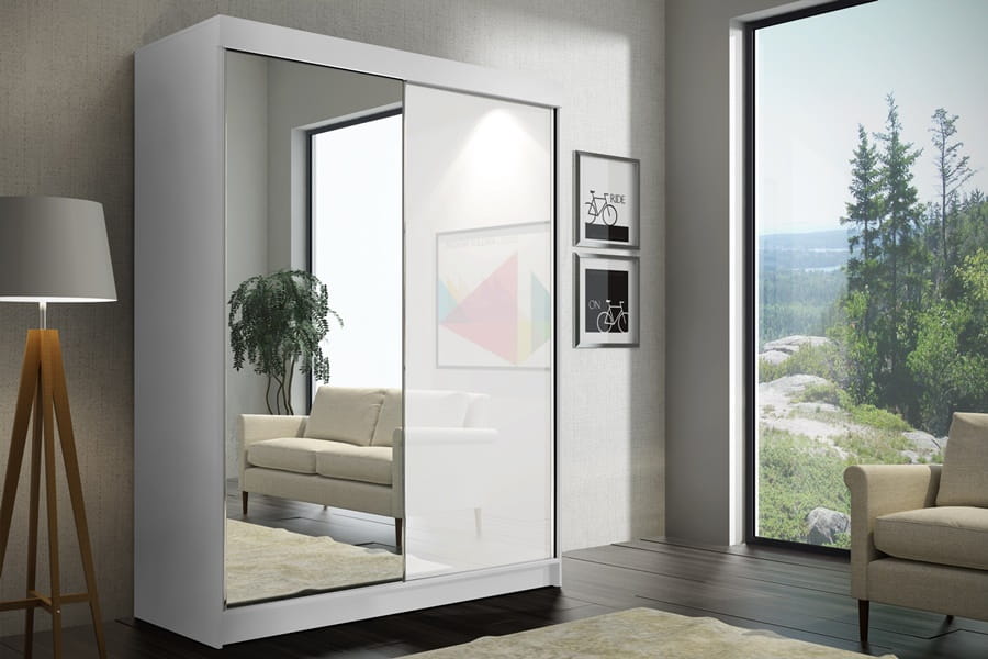 Nowoczesna szafa przesuwna GABI 120 cm wykonana została z płyty laminowanej o grubości 16 mm. Na jej drzwiach przesuwnych znajduje się lustro oraz szkło ozdobne typu Lacobel. Wybarwienia szkła frontów dostępne w dwóch modnych kolorach: biały oraz czarny.