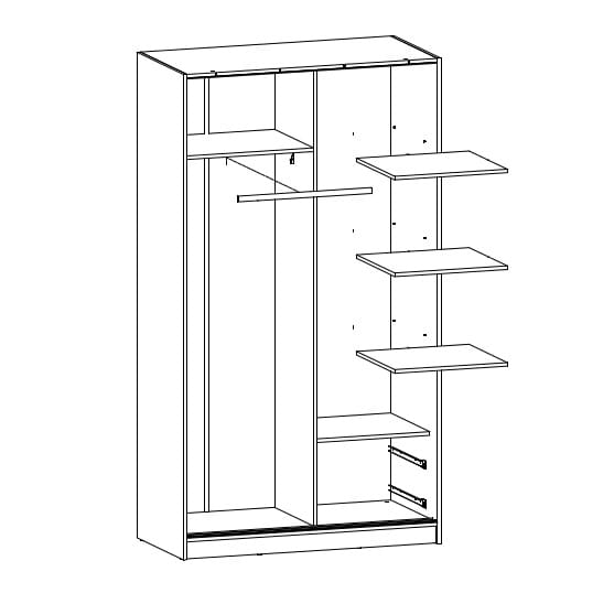 W skład zestawu wchodzą: korpus szafy, drążek, półki, szuflady, zestaw montażowy oraz szkło. Front szafy stanowi płyta laminowana zdobiona szkłem lub lustrem wykończona ozdobnymi elementami aluminiowymi. System jezdny stanowią prowadnice aluminiowe oraz kółka ułożyskowane.
