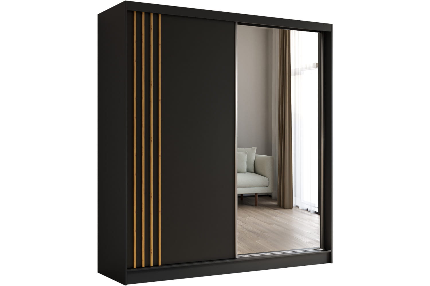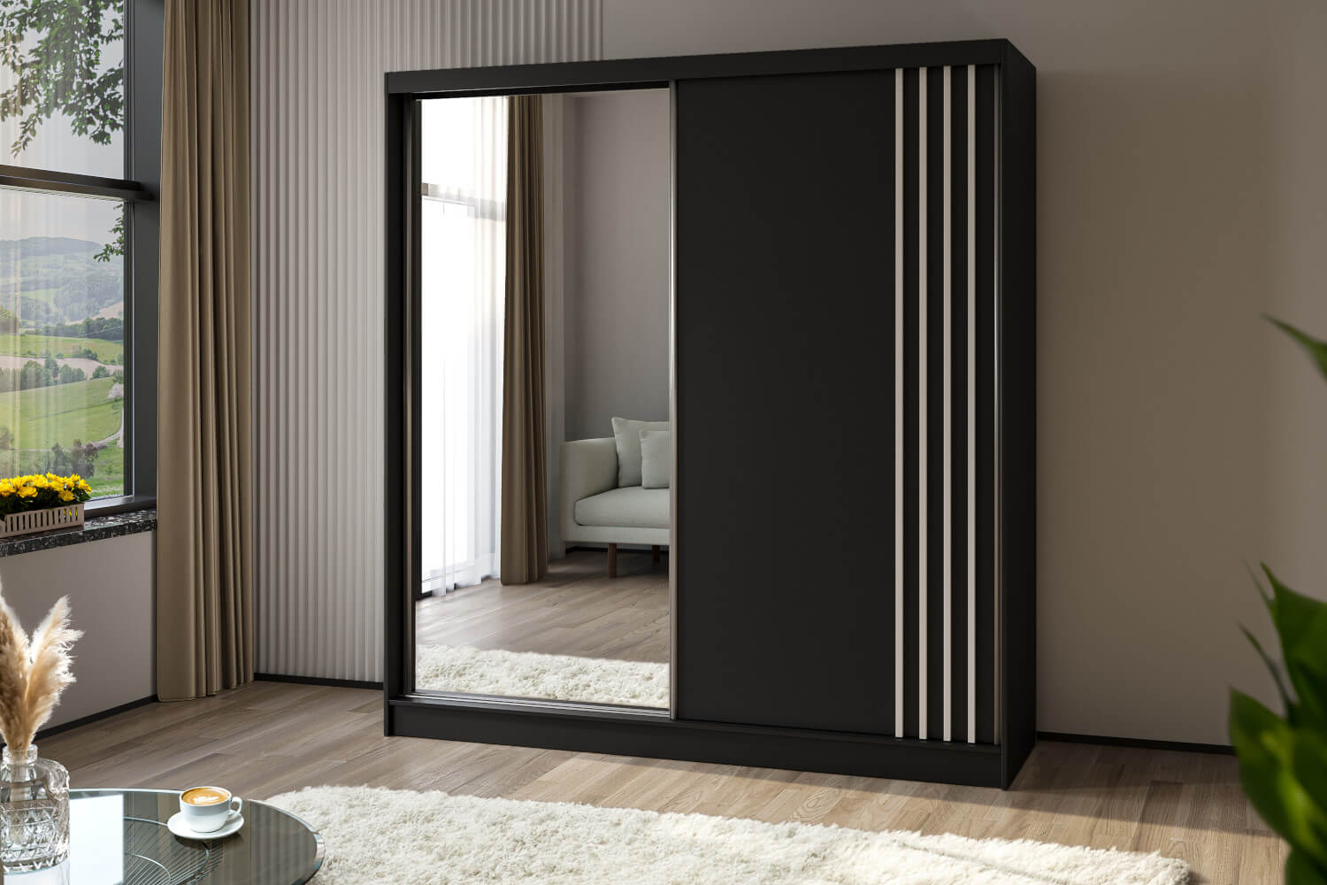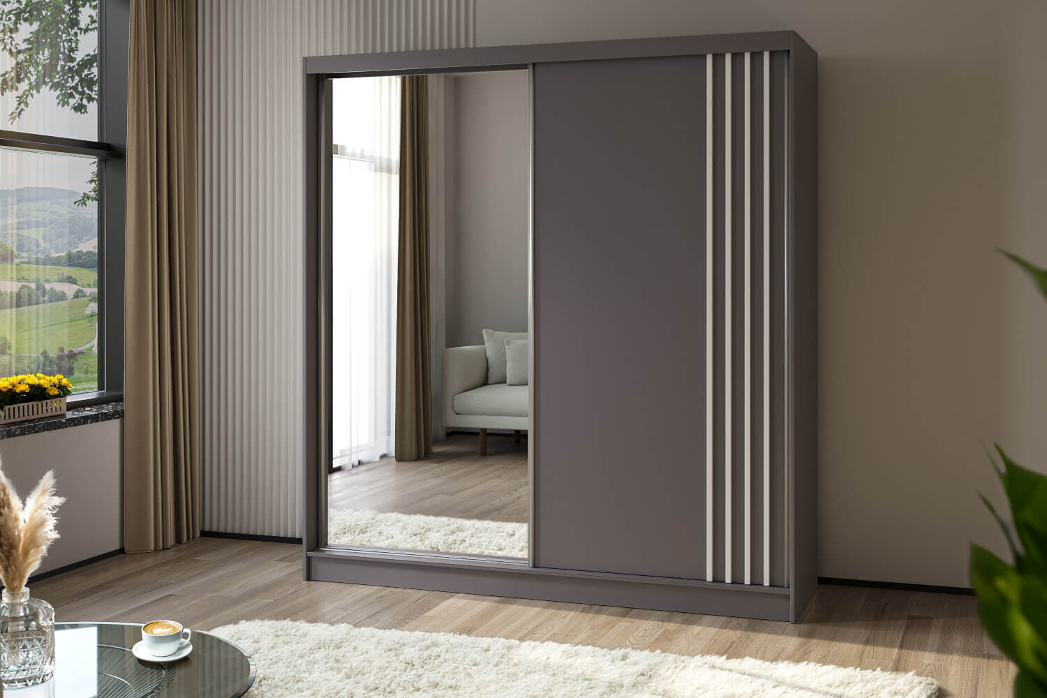 Szafa NILA w wersji o szerokości 200 cm to idealne rozwiązanie dla tych, którzy cenią sobie elegancję i funkcjonalność. Jej drzwi zdobi lustro oraz ozdobne lamele, które nadają wnętrzu subtelny i nowoczesny charakter.