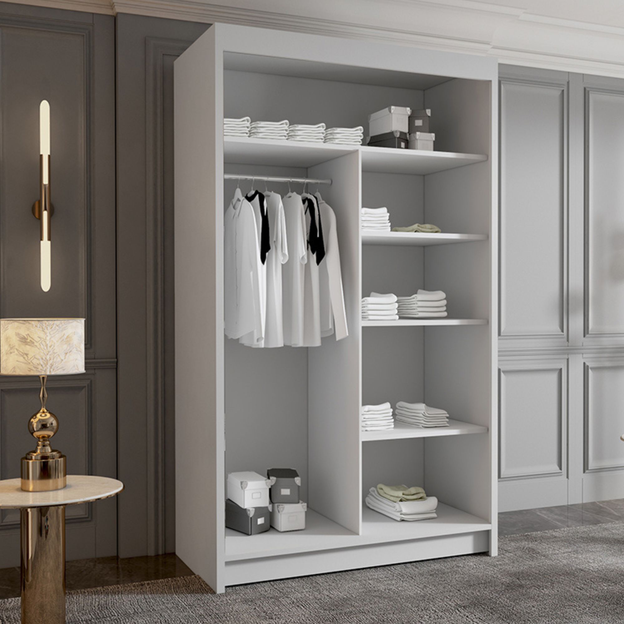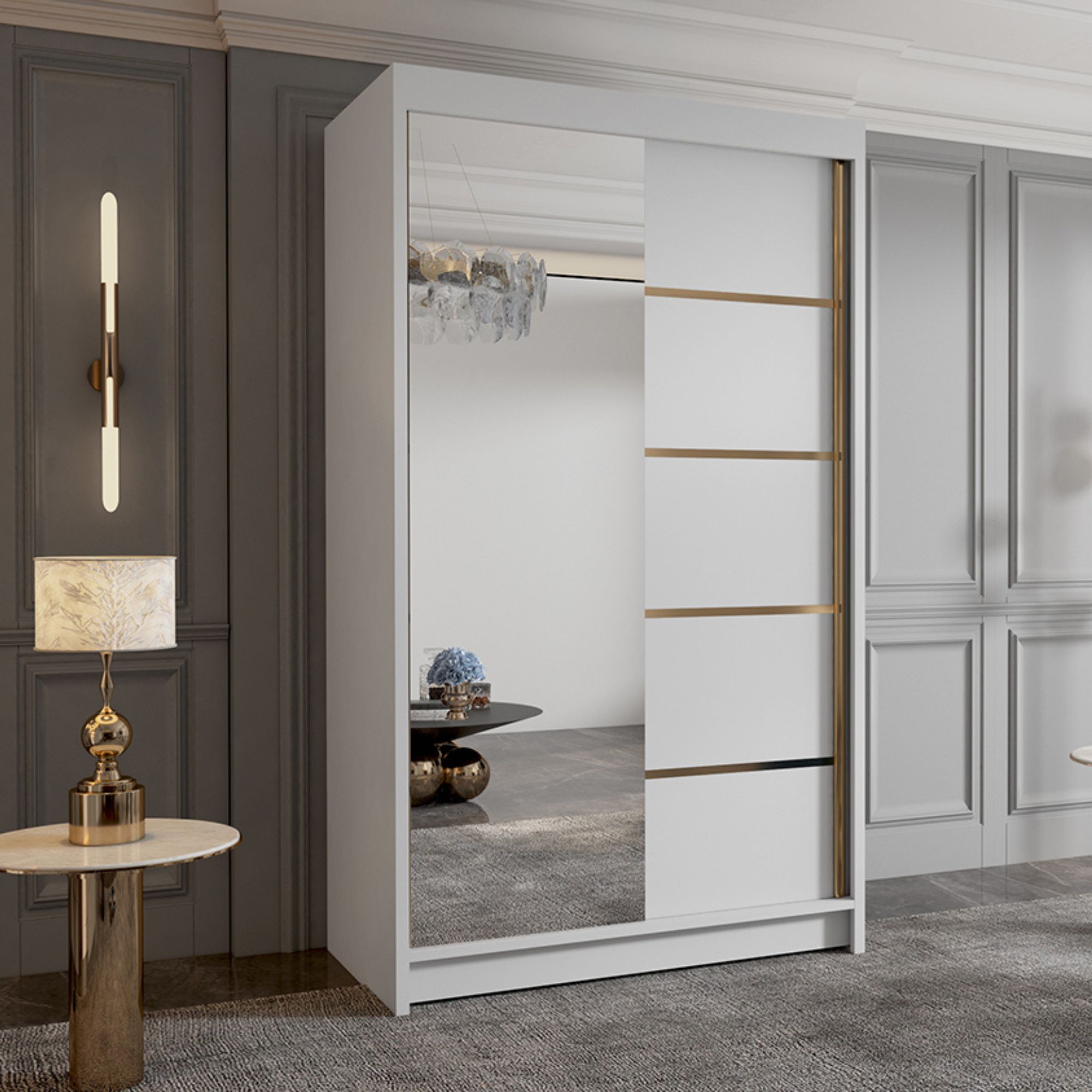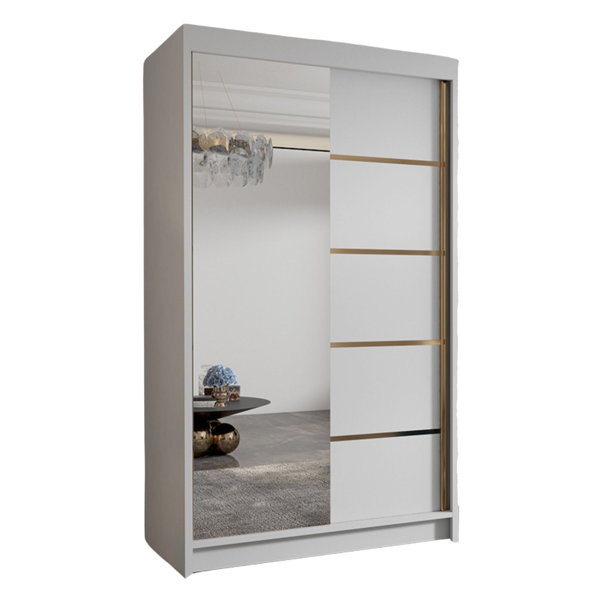 Szafa przesuwna WIGO prezentuje się jako nowoczesna interpretacja klasycznej elegancji z nutą luksusu. Jej bryła utrzymana w jasnym, matowym wykończeniu z poziomymi, złotymi wstawkami, nadaje wnętrzu szlachetnego charakteru. Duże lustro na jednym z frontów wprowadza wrażenie głębi i przestrzeni, idealnie rozświetlając pomieszczenie. To mebel, który łączy efektowny wygląd z ponadczasową prostotą.