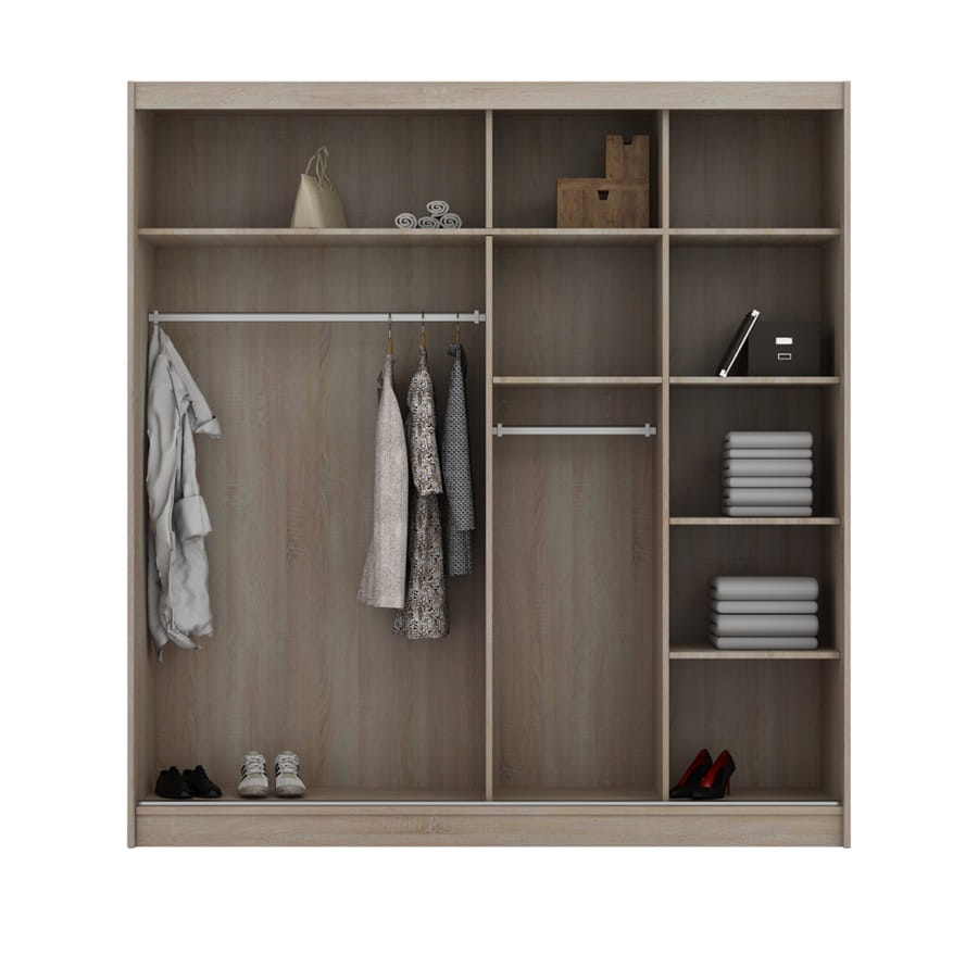 FENIG 200 cm to efektowna szafa przesuwana o funkcjonalnym wnętrzu. Posiada praktyczne półki oraz drążki, które pomogą nam zaprowadzić ład i porządek w szafie. Na jednym z frontów zostało zamontowane lustro, któremu charakteru nadają ozdobne szprosy. Szafa wykonana z wysokiej jakości materiałów, będzie z pewnością służyła przez długie lata.