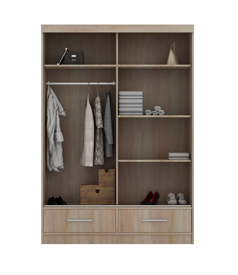 W skład zestawu wchodzą: korpus szafy, drążek, półki, szuflady oraz zestaw montażowy. Front szafy stanowi płyta laminowana. System jezdny stanowią prowadnice aluminiowe oraz kółka ułożyskowane.