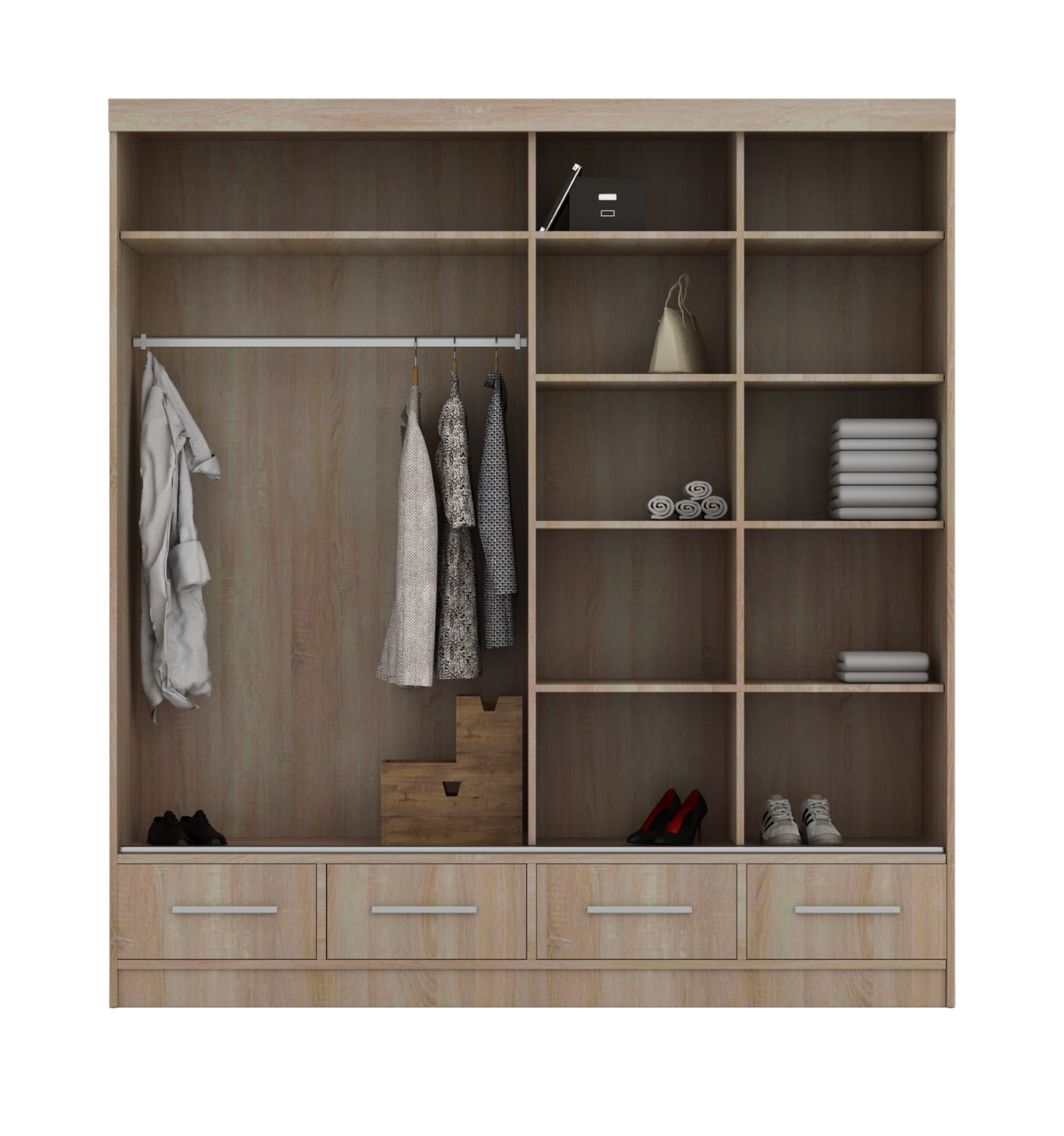 Szafa SYBILA stanowi sporych rozmiarów miejsce składowania ubrań oraz sprzętów domowych. Jej kolorystyka definiuje się w monochromatyce - jest dostępna w barwie białej czarnej i szarej, z dodatkiem połysku na frontach. Dolne partie szafy zostały zajęte przez cztery szuflady, w których przechowasz wszelkie drobiazgi. Wyżej, za dwojgiem przesuwnych drzwi z uchwytami, przyozdobionymi dużym lustrem, znajduje się dziewięć półek oraz drążek na wieszaki z ubraniami. Ciekawym dodatkiem jest również eleganckie oświetlenie LED, dzięki któremu zbudujesz wyjątkowy nastrój w przestrzeni swojego salonu lub sypialni.