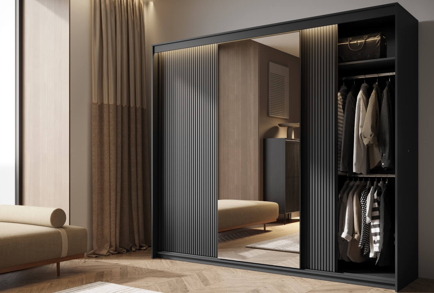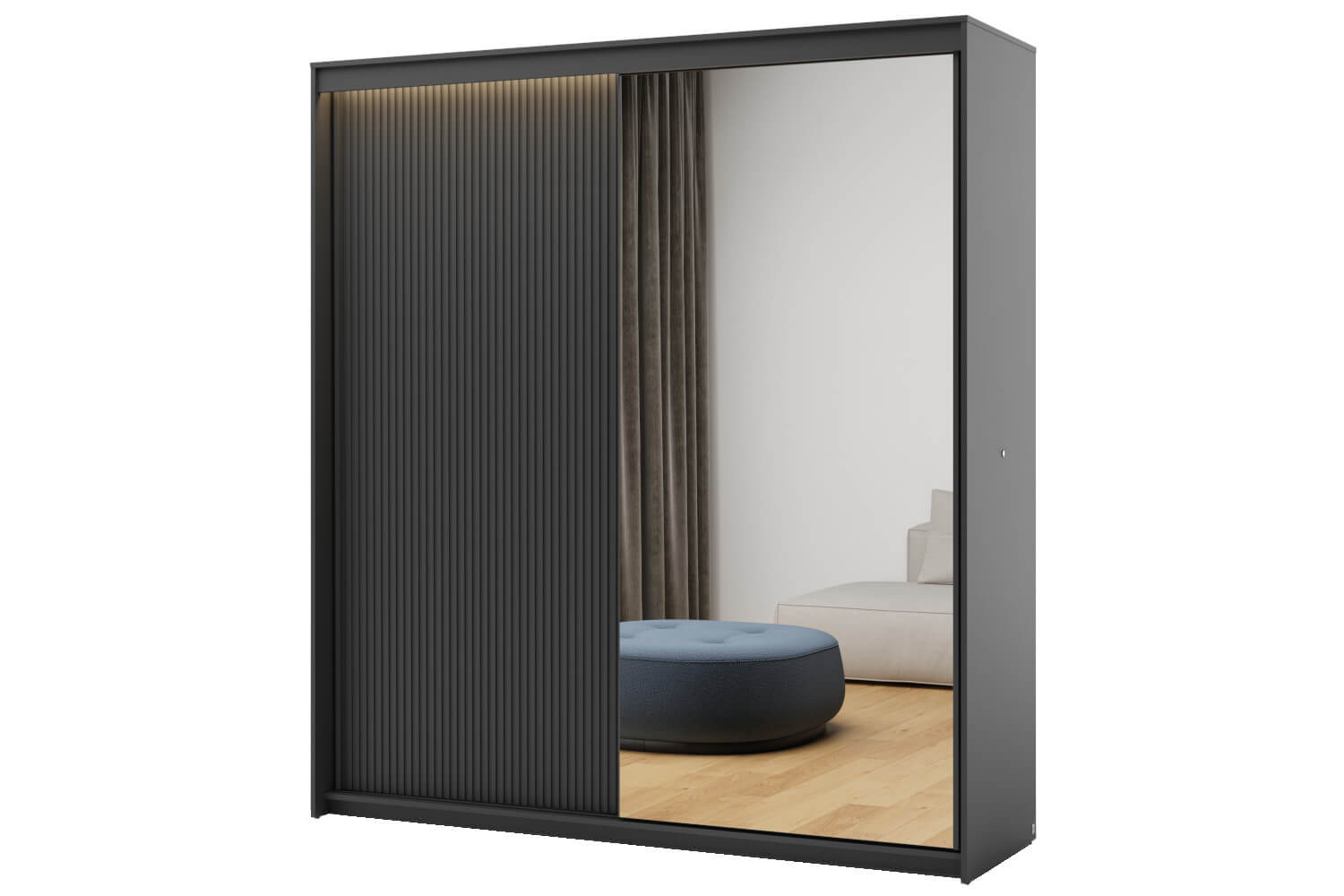 Szafa TZ-01 to nowoczesne i funkcjonalne rozwiązanie do modnego wnętrza. Szerokość 200 cm zapewnia dużą przestronność i wygodę użytkowania. Jest to model dwudrzwiowy, z jednym frontem wyposażonym w lustro, które optycznie powiększa przestrzeń i dodaje elegancji. Drugie drzwi wykończone są ryflowaniem, co tworzy interesujący kontrast i stylowy wygląd. Dodatkowo, szafa została wyposażona w oświetlenie LED, które nie tylko poprawia widoczność, ale także dodaje subtelnego, nowoczesnego akcentu, idealnego do wieczornego użytkowania.