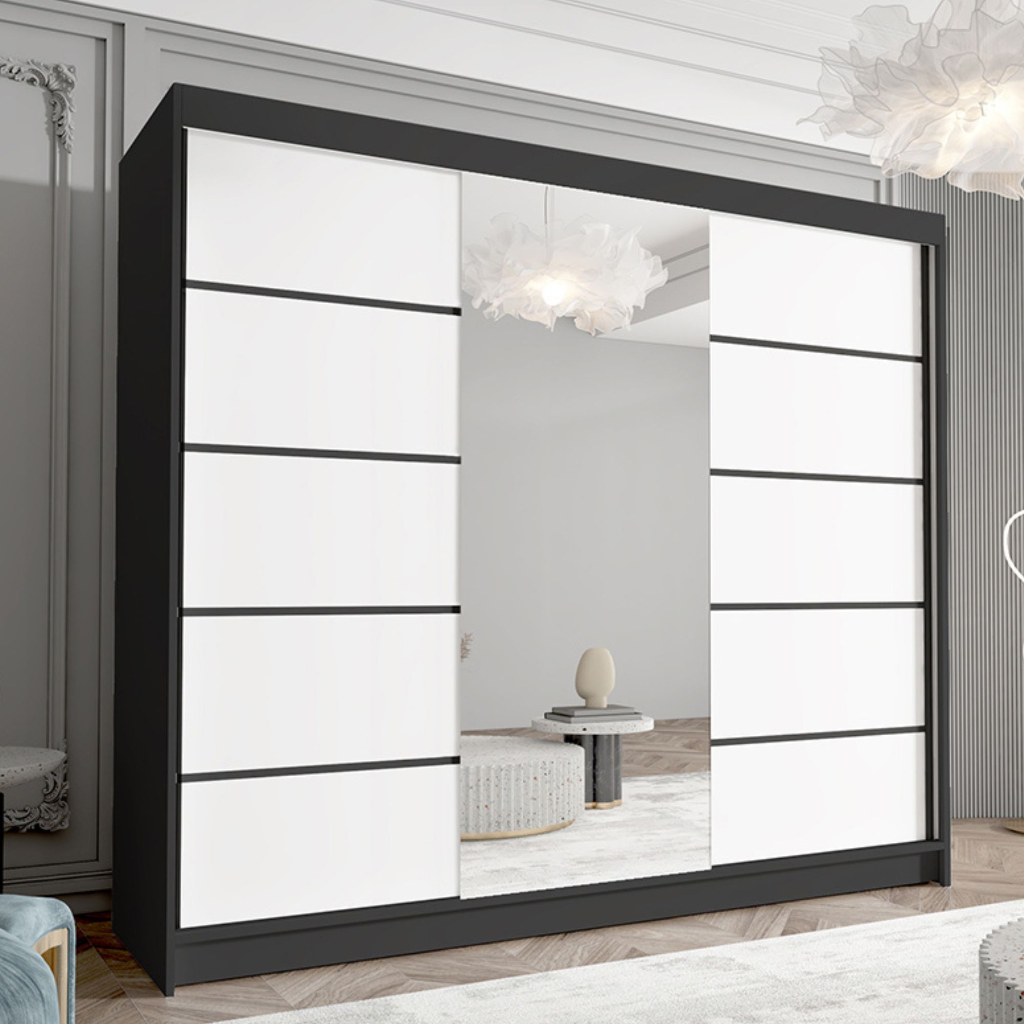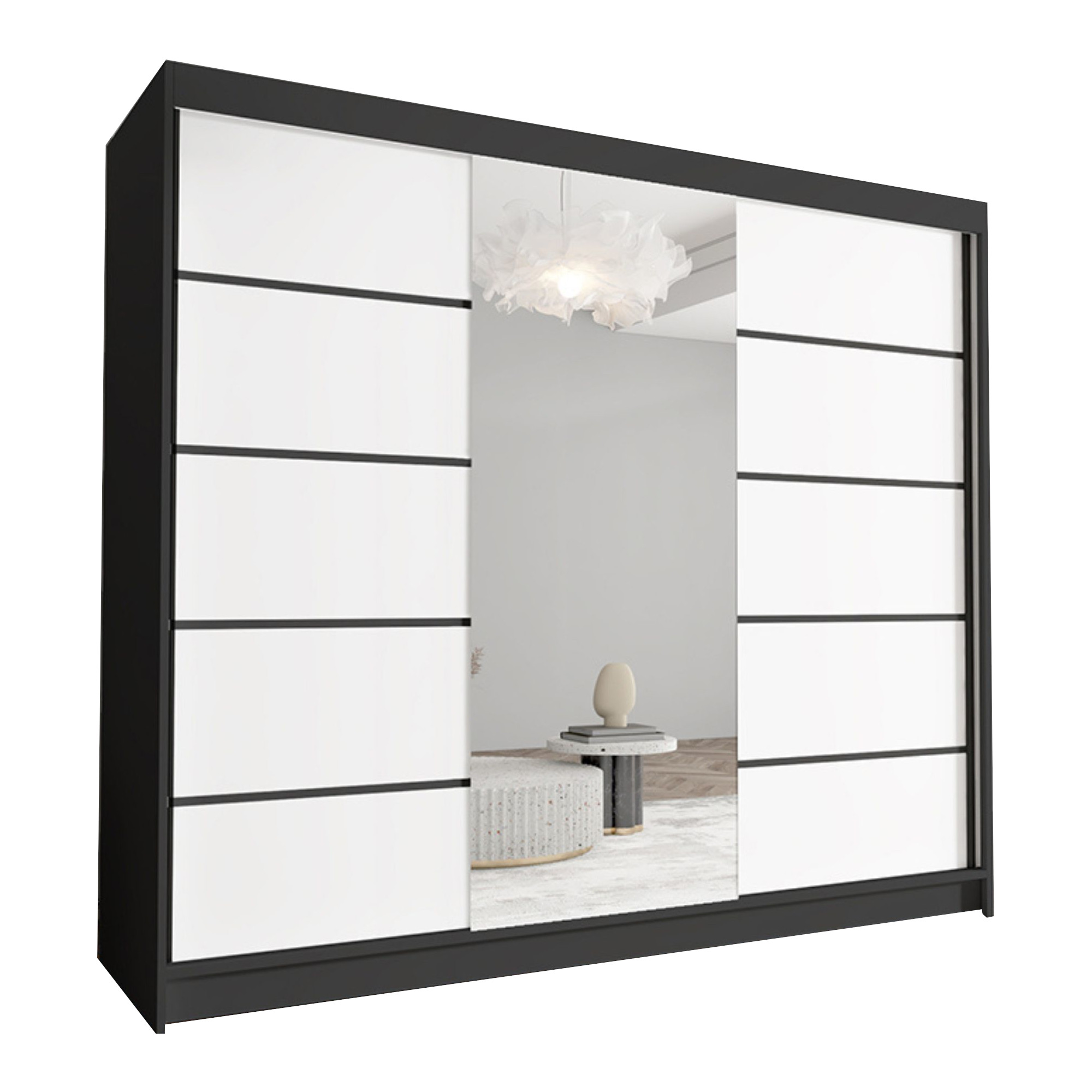 Szafa DIAVO z białymi frontami i czarnym korpusem to propozycja dla osób poszukujących mocniejszego kontrastu i bardziej wyrazistego efektu wizualnego. Taki duet kolorystyczny nadaje wnętrzu nowoczesny, loftowy charakter, idealnie komponując się z industrialnymi i minimalistycznymi aranżacjami.