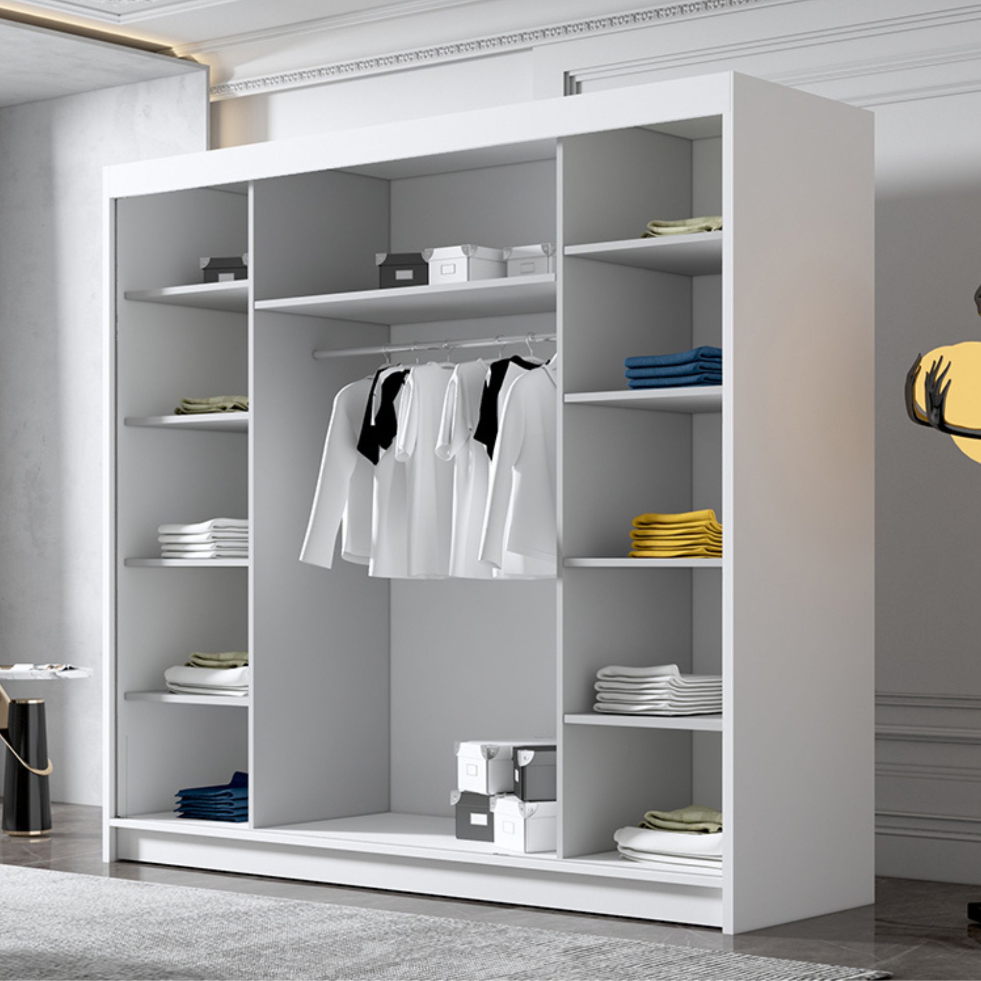 Szafa DAVO oferuje przemyślany układ wnętrza – miejsce na wieszaki, półki oraz przestrzeń do przechowywania większych przedmiotów, co czyni ją niezwykle praktycznym wyborem na co dzień. Jej konstrukcja została zaprojektowana tak, by maksymalnie wykorzystać dostępną przestrzeń, bez rezygnacji z estetyki.