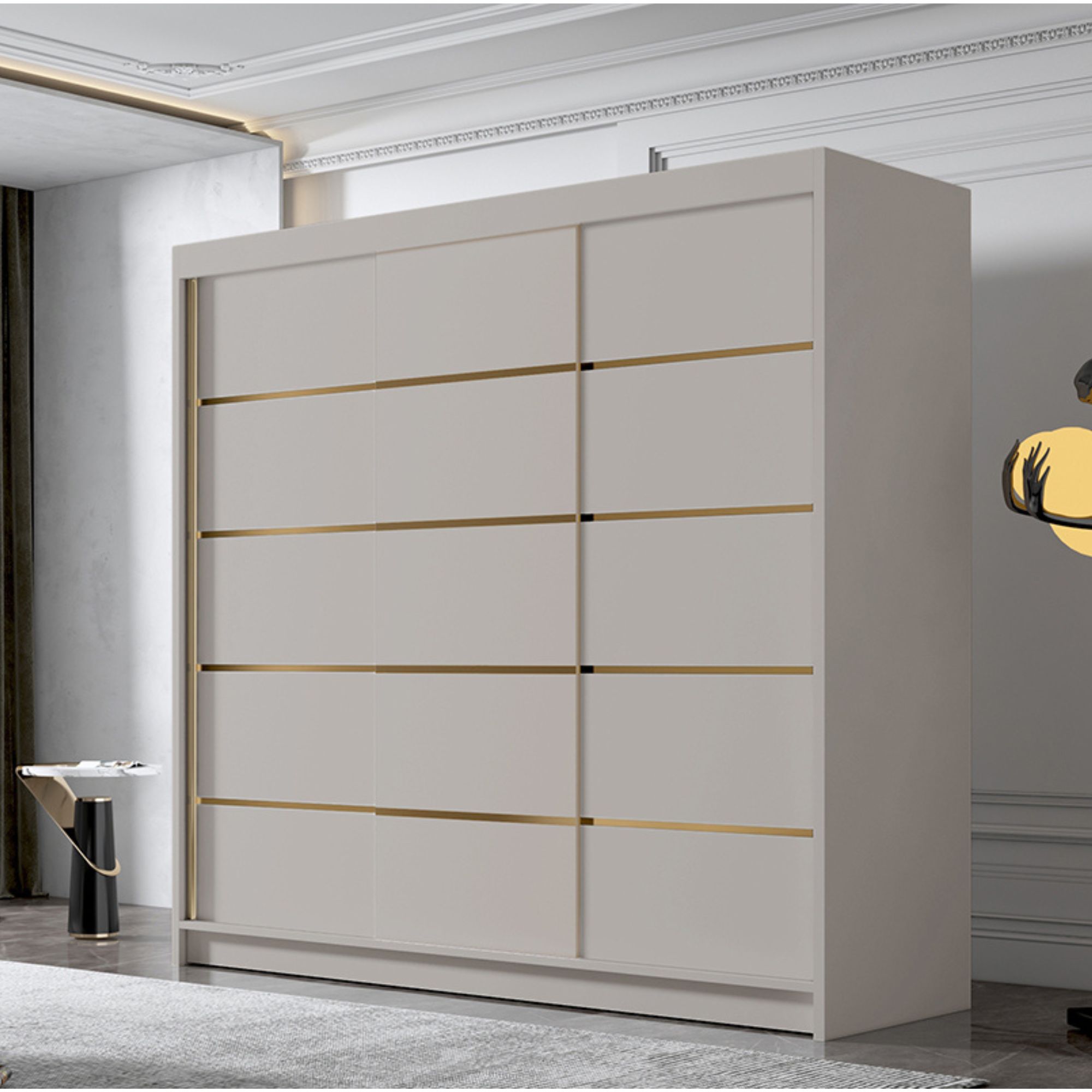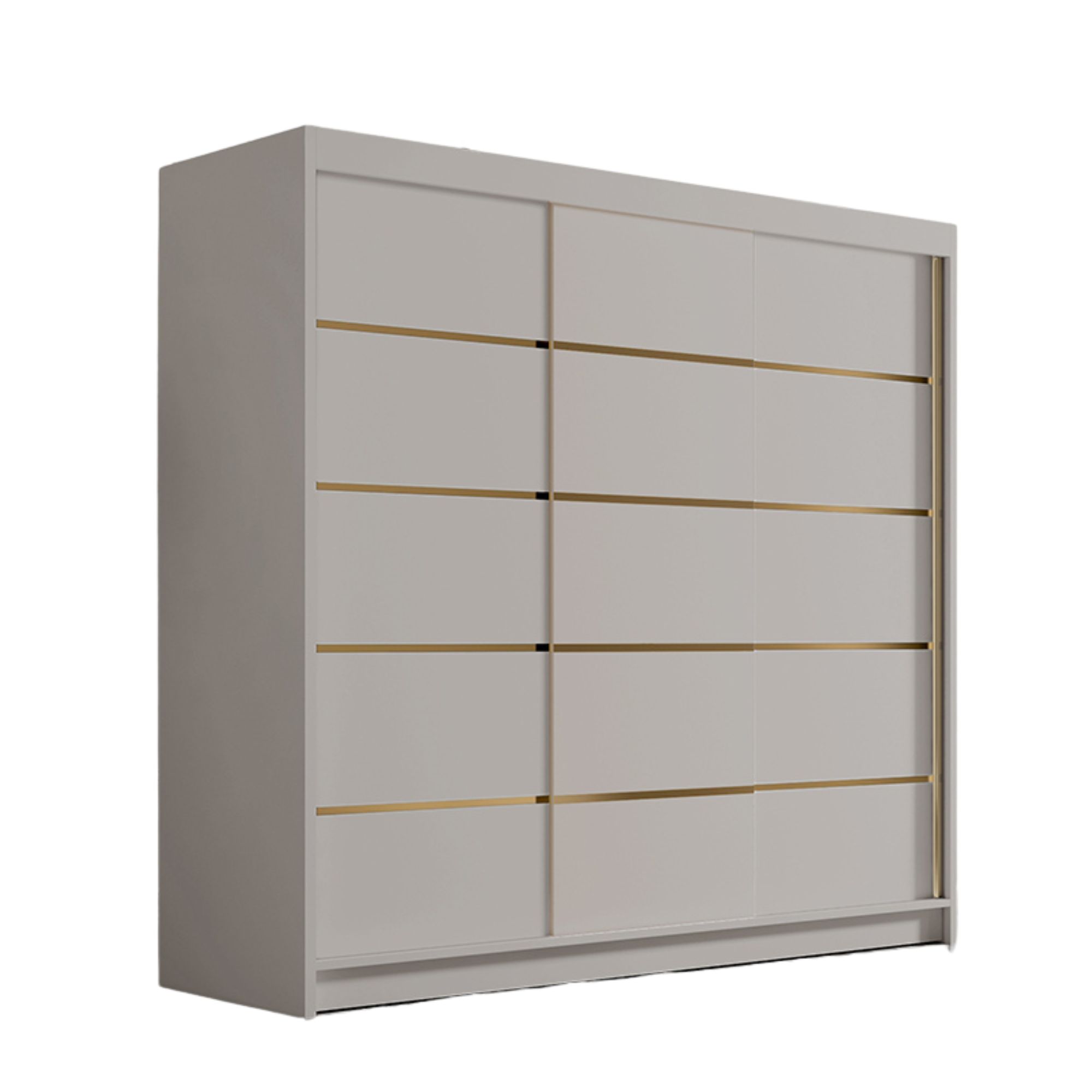 Szafa przesuwna DAVO w kolorze kaszmir to subtelna i ciepła alternatywa dla klasycznej bieli. Delikatny, piaskowy odcień, wprowadza do wnętrza przytulność i elegancję, tworząc harmonijne tło dla pozostałych elementów aranżacji. Złote szprosy na frontach doskonale komponują się z kolorem kaszmiru, podkreślając jego szlachetny charakter i dodając całości wyjątkowego stylu.