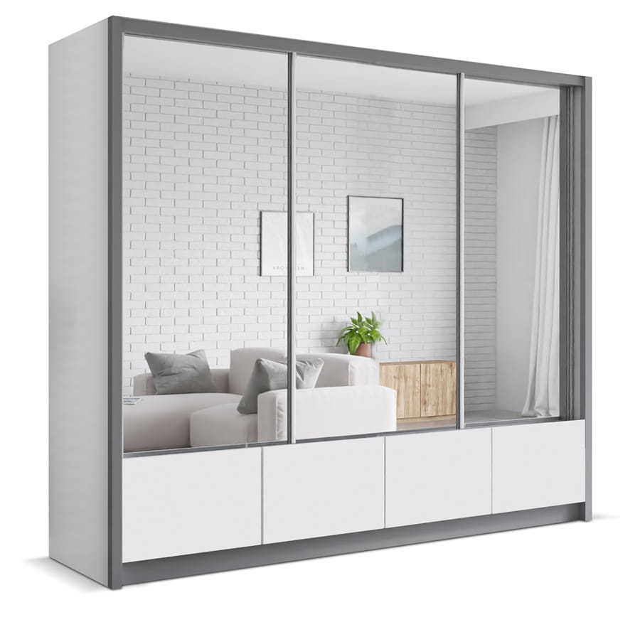 Odpowiednie składowanie i unikalną estetykę bez wątpienia zapewni szafa LUISA. Dostępna w czterech rozmiarach wpasuje się w każde nowocześnie urządzone wnętrze, dzięki uniwersalnej, nieinwazyjnej kolorystyce korpusu - bieli z szarą listwą. Fronty czterech dolnych szuflad możesz wybrać również spośród tych dwóch barw. Za trojgiem drzwi przesuwnych z dużymi lustrami, skrywa się pięć szerokich półek oraz trzy drążki, stworzone z myślą o organizacji okryć wierzchnich bądź ubrań, które łatwo się gniotą na wieszakach. Niezależnie czy postanowisz umieścić szafę w swojej sypialni czy w przedpokoju, zapewni łatwy dostęp do posegregowanych ubrań i sprzętów.