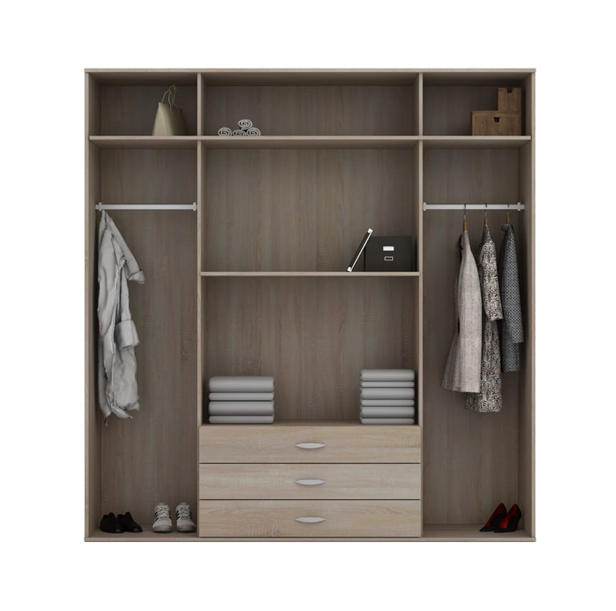 Szafa RIZE to bardzo funkcjonalny mebel. Wykonana została z wysokiej jakości płyty laminowanej. Na jej środkowych drzwiach znajduje się lustro, po jego lewej stronie znajdują się półki, natomiast w drugiej część szafy znajduje się drążek na ubrania. Dostępne wybarwienia drewna to: olcha, dąb sonoma.