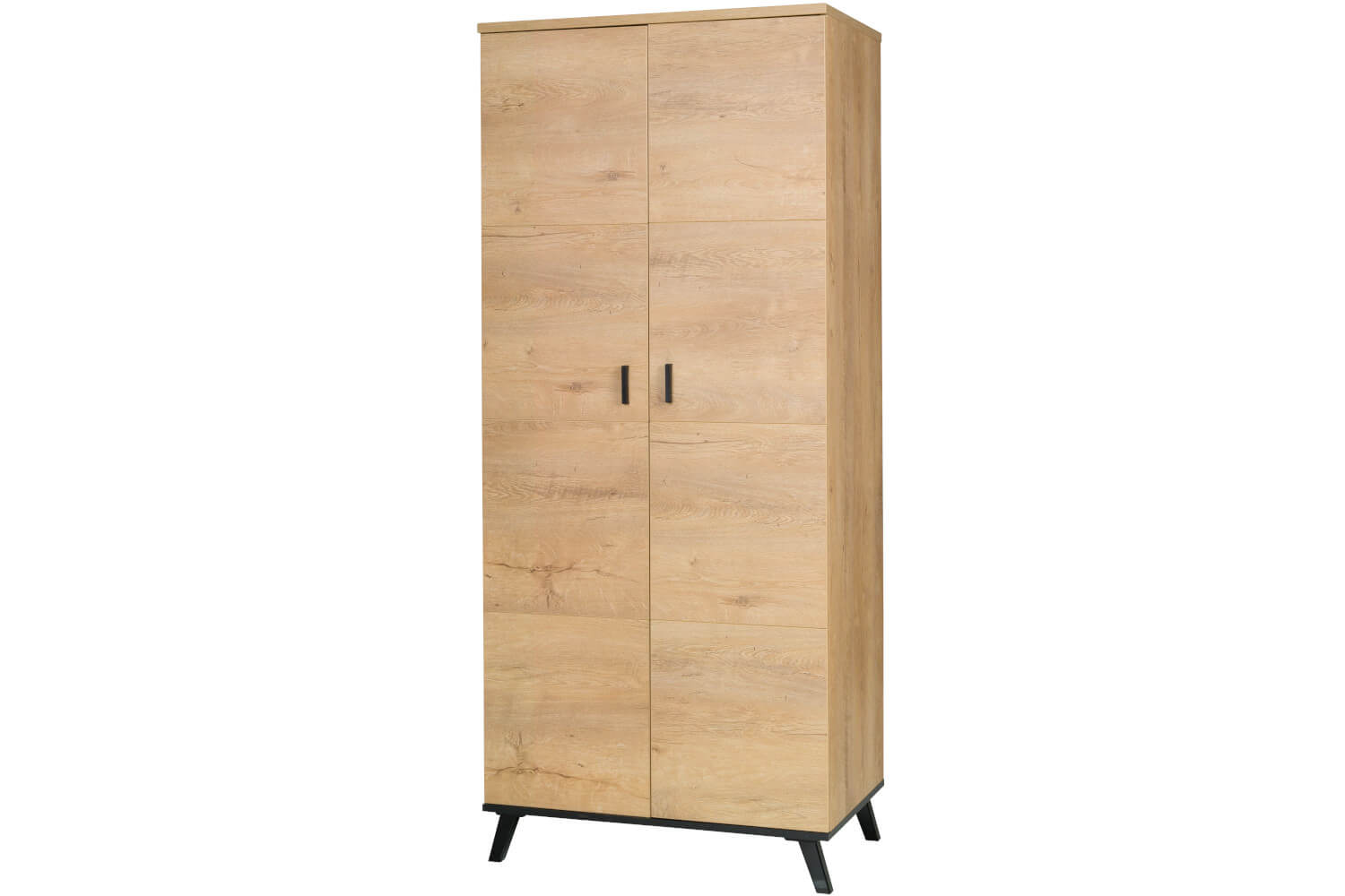 Szafa posiada dwoje segmentowanych, smukłych drzwi z czarnymi uchwytami, za którymi skrywa się drążek z półką. Praktyczna i pojemna przechowa wszystkie rzeczy potrzebne w salonie, które nie muszą znajdować się na widoku. Istnieje możliwość dokupienia dodatkowych trzech półek.