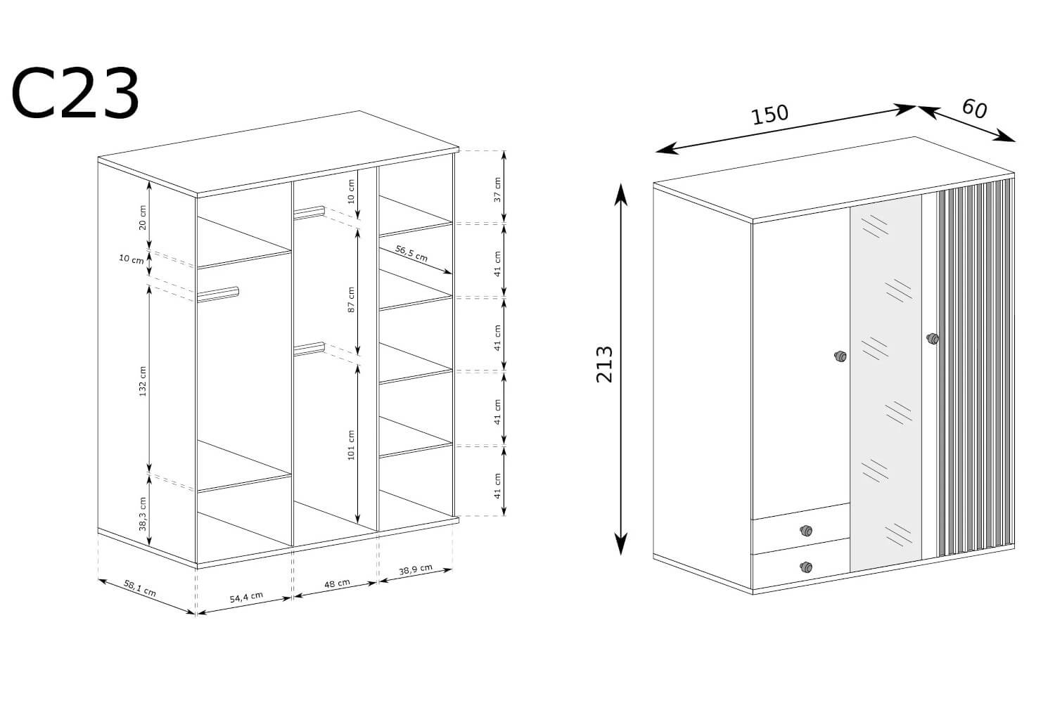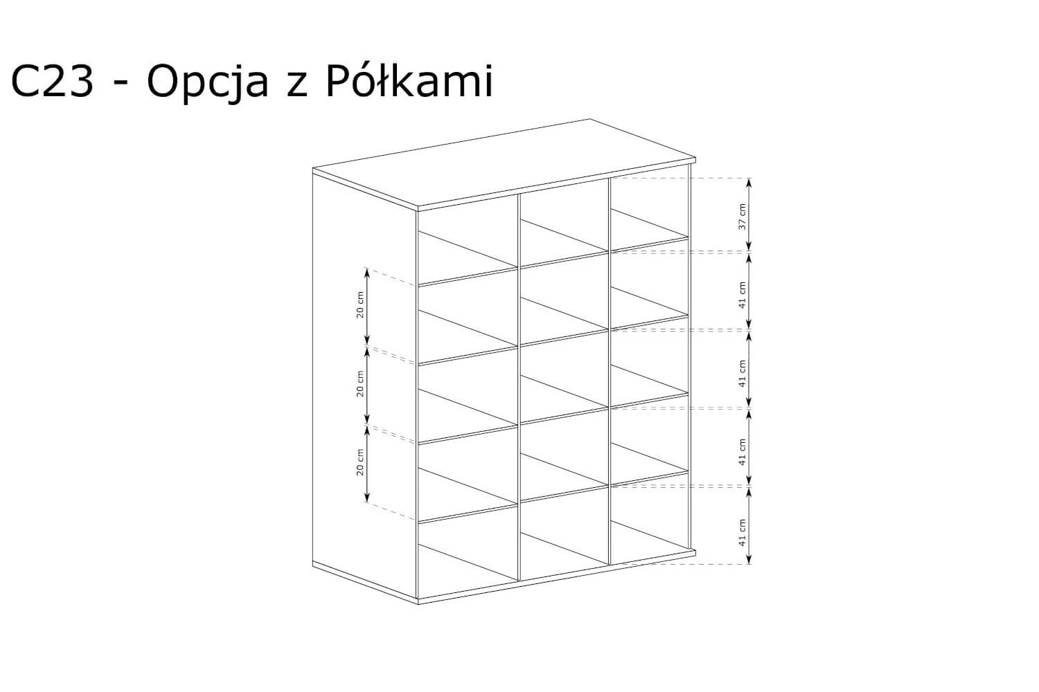 Model kolekcji Cali C-23 to eleganckie i funkcjonalne rozwiązanie do przechowywania. Szafa została wykonana z laminowanej płyty meblowej, co gwarantuje łatwe czyszczenie i odporność na uszkodzenia. Front szafy zdobią eleganckie lustro oraz lamele. Wewnątrz szafy oferuje wiele praktycznych rozwiązań organizacyjnych. Po lewej stronie znajduje się półka, idealna do przechowywania ubrań czy akcesoriów. Dodatkowo znajdziesz tutaj dwie szuflady oraz drążek. W środkowej części szafy znajdują się dwa drążki, co zapewnia dodatkową przestrzeń do zawieszenia ubrań. Po prawej stronie umieszczono cztery półki, doskonałe do przechowywania różnych przedmiotów użytku codziennego. Opcja dokupienia dodatkowych półek daje możliwość dostosowania szafy do indywidualnych potrzeb i preferencji użytkownika, zapewniając jeszcze większą funkcjonalność i organizację przestrzeni.