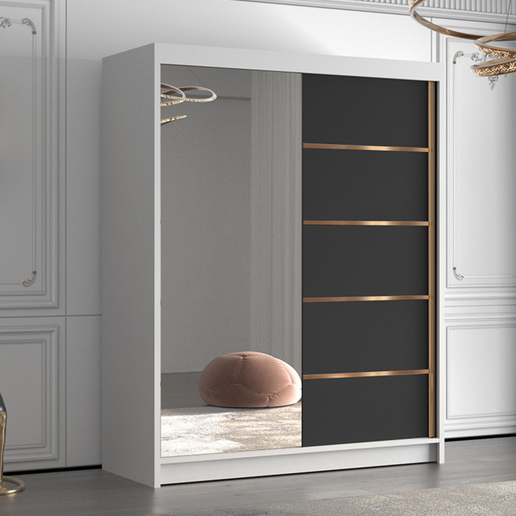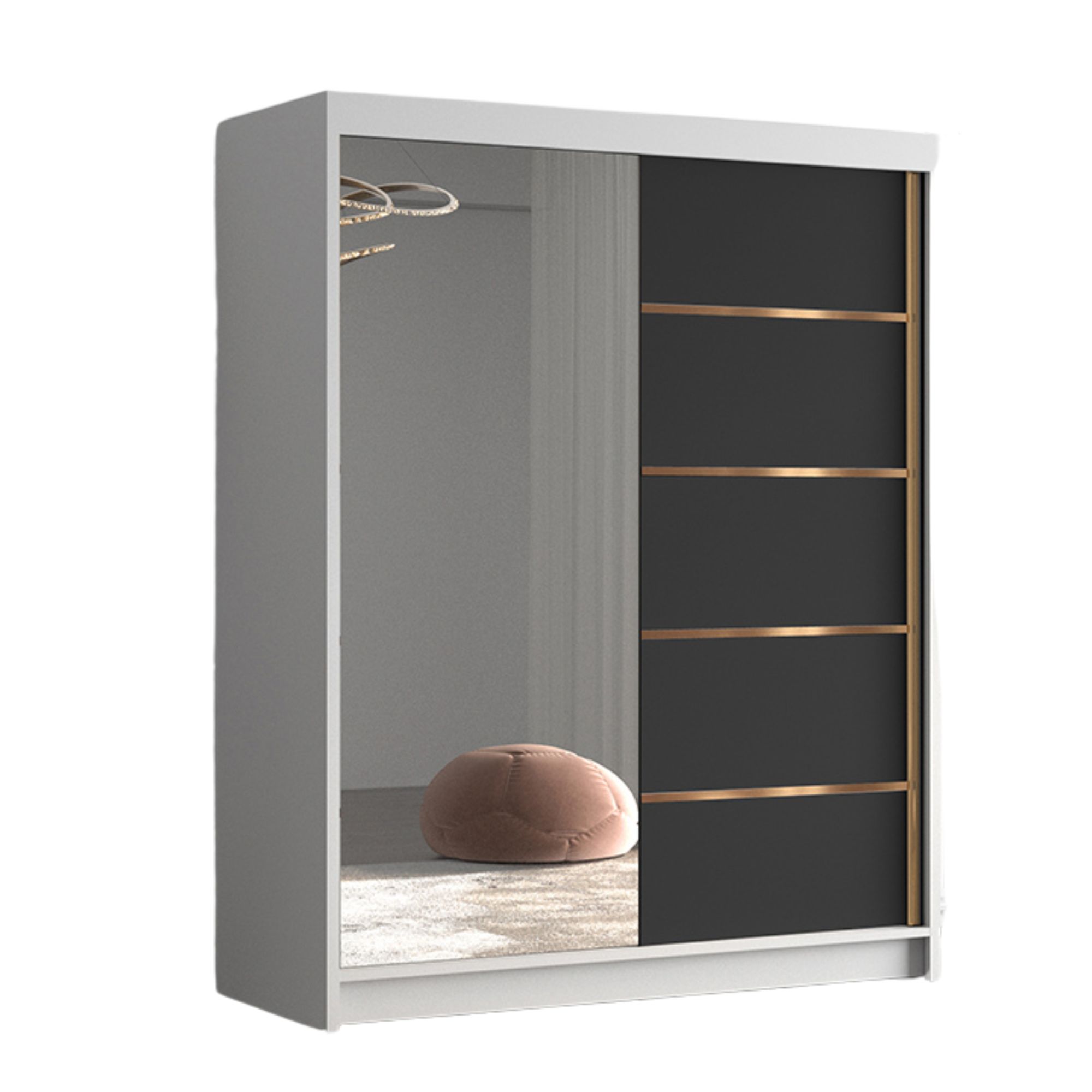 Design szafy FLAVI to połączenie nowoczesnej formy i ponadczasowego minimalizmu. Po jednej stronie znajduje się lustrzany panel, a po drugiej – matowe wykończenie z poziomymi złotymi wstawkami, co tworzy efektowny kontrast. Gładkie powierzchnie i ukryte prowadnice sprawiają, że całość prezentuje się wyjątkowo estetycznie i schludnie.