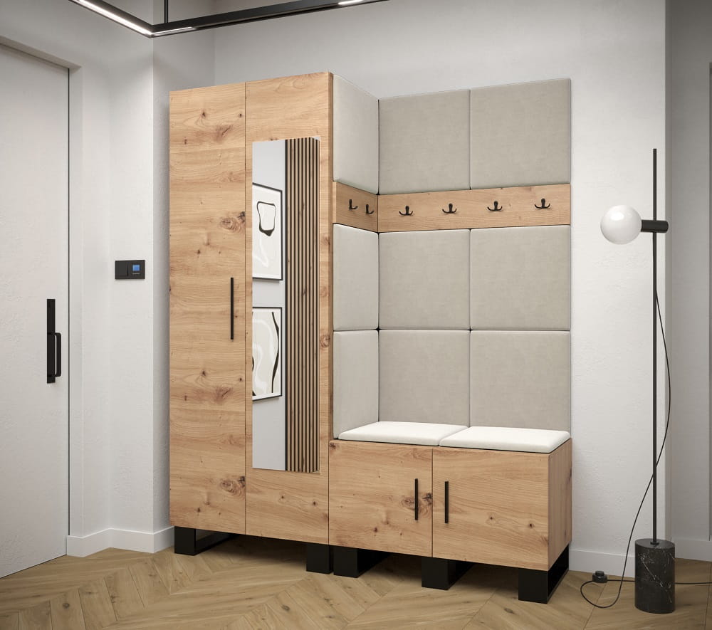 Kolekcja mebli do przedpokoju MARTIS to kilka elementów, dzięki którym możesz stworzyć pełnowymiarową, funkcjonalną garderobę w przedpokoju. Szafa uchylna w wersji z lustrem lub bez, niewielka komoda z szufladą, pojemna szafka na buty, wieszak oraz wyjątkowo miękkie i przytulne panele tapicerowane. MARTIS stanie się kompletną garderobą w Twoim domu.