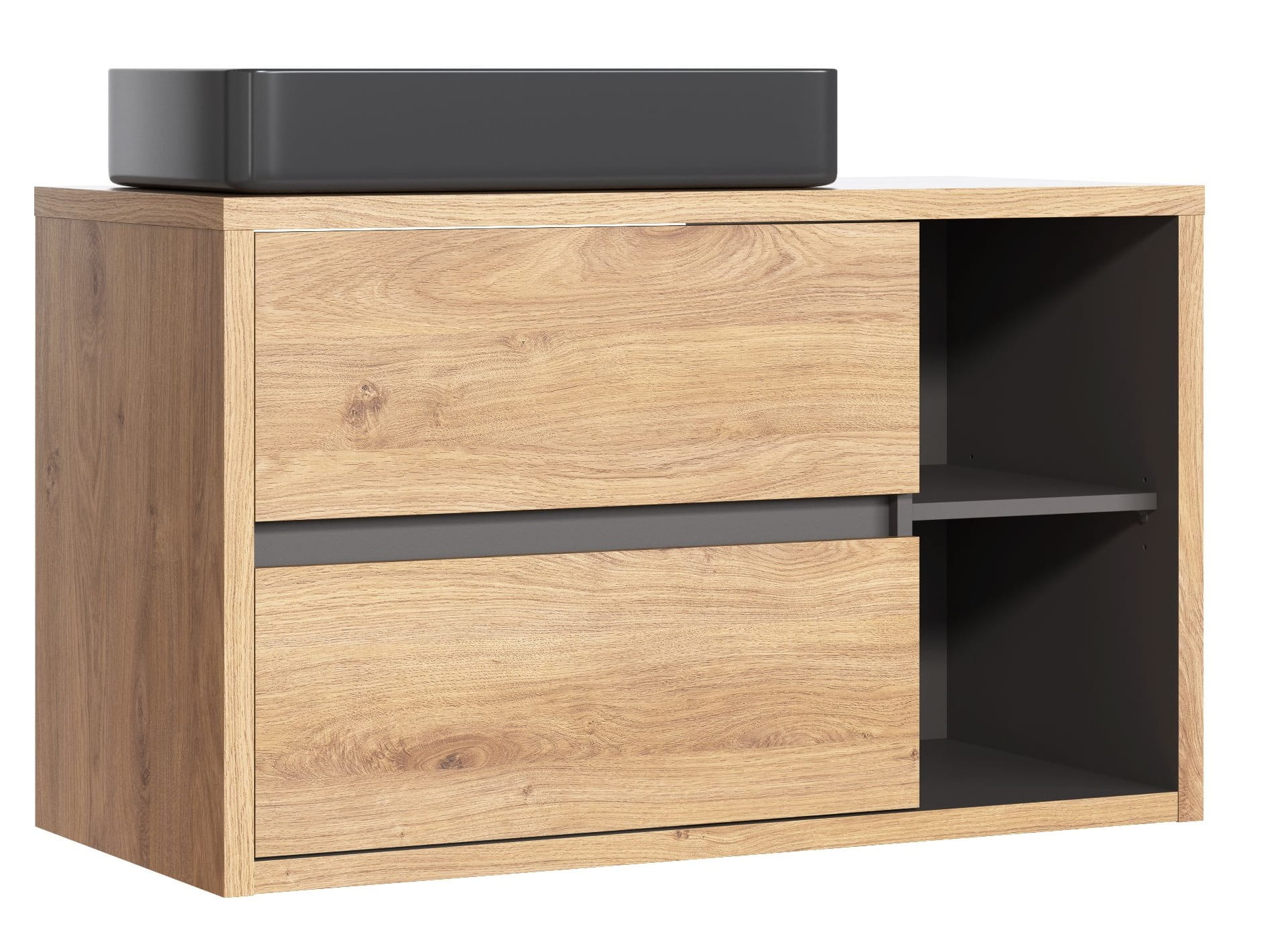 Szafka DEVON 823 jest wyposażona w dwie pojemne szuflady z systemem cichego domyku. Po ich prawej stronie znajdizemy dwie otwarte przestrzenie doskonałe do odłożenia ręczników czy drobnych akcesoriów łazienkowych.