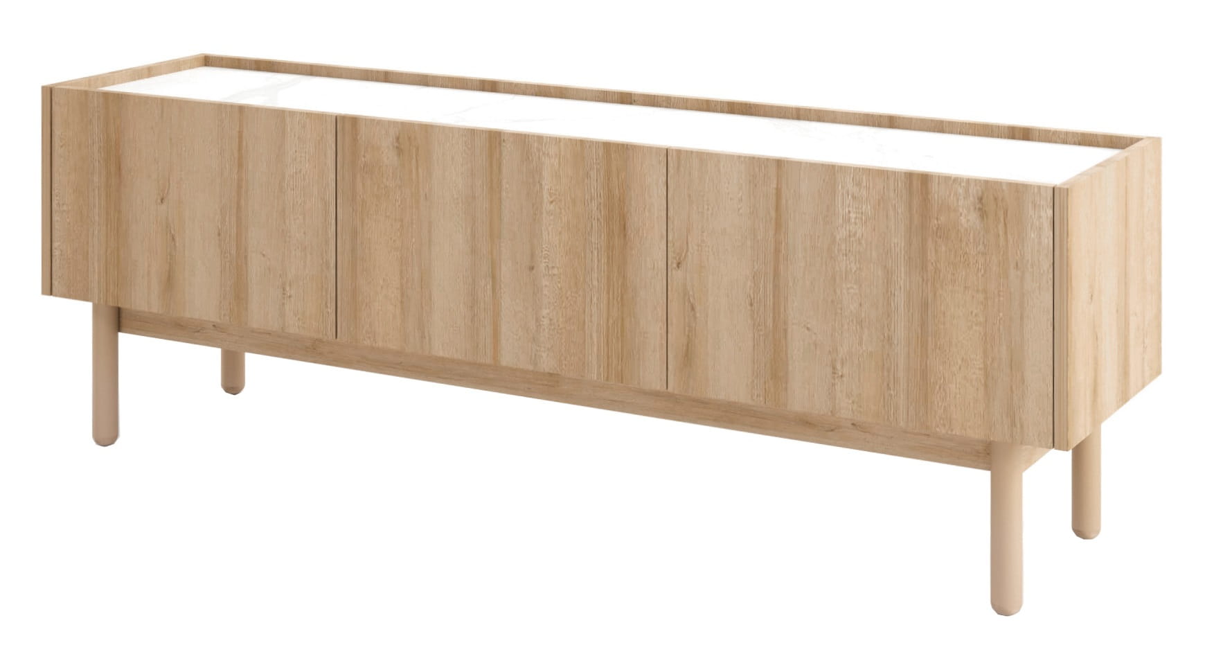 Kolekcja mebli do salonu BOHO to połączenie elegancji i stylu. Meble wykonane są z płyty laminowanej, a nogi z drewna o wysokości 19,5 cm. Kolekcja składa się z różnych komód. Kolor dąb riviera nadaje meblom ciepły i przytulny charakter, a blaty górne w kolorze marmur bianco imitującego kamień marmurowy, dodają elegancji. Ta kolekcja jest idealna dla tych, którzy cenią sobie wygodę i styl w jednym. Kolekcja jest wykonana z najwyższej jakości materiałów, płyta laminowana jest odporna na zarysowania i łatwa w utrzymaniu czystości, a drewniane nogi zapewniają stabilność i wytrzymałość mebli. Styl BOHO jest obecnie jednym z najmodniejszych trendów w architekturze wnętrz, łączącym w sobie elegancję i swobodę, a ta kolekcja idealnie wpisuje się w ten trend idealnie.
