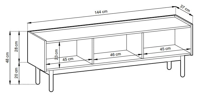 Szafka RTV Boho na nóżkach w kolorze drewna to elegancki mebel z trzema zamkniętymi szafkami, który pozwala na estetyczne i schludne przechowywanie sprzętu elektronicznego.