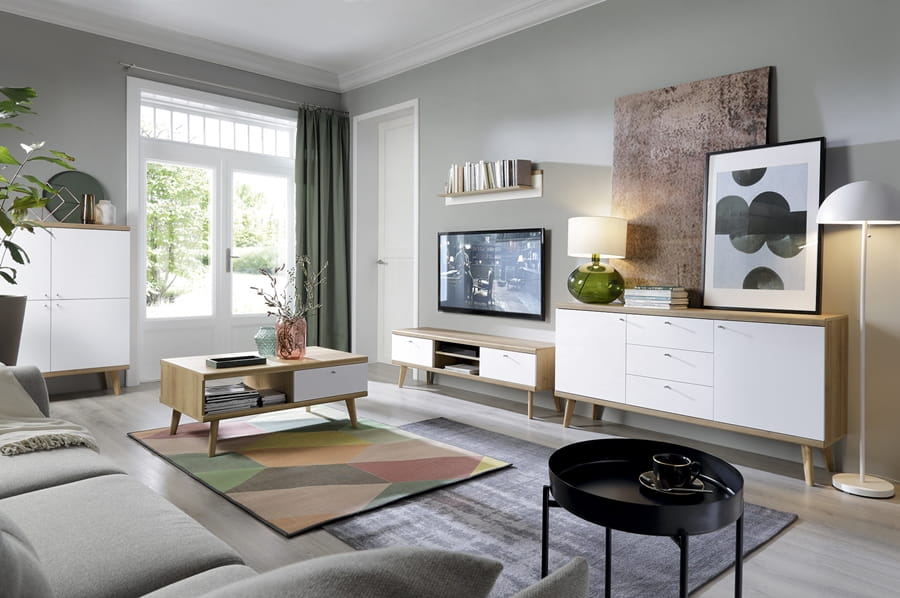 Kolekcja mebli RIMPO cechuje skandynawski styl, prosty design oraz neutralna kolorystyka, dzięki której sprawdzi się ona w każdym wnętrzu. Połączenie stonowanych barw, sprawiło ,że meble są uniwersalne i znajdą zastosowanie w salonie, przedpokoju oraz sypialni. Wykonanie z wysokogatunkowej płyty laminowanej gwarantuje długowieczność.
