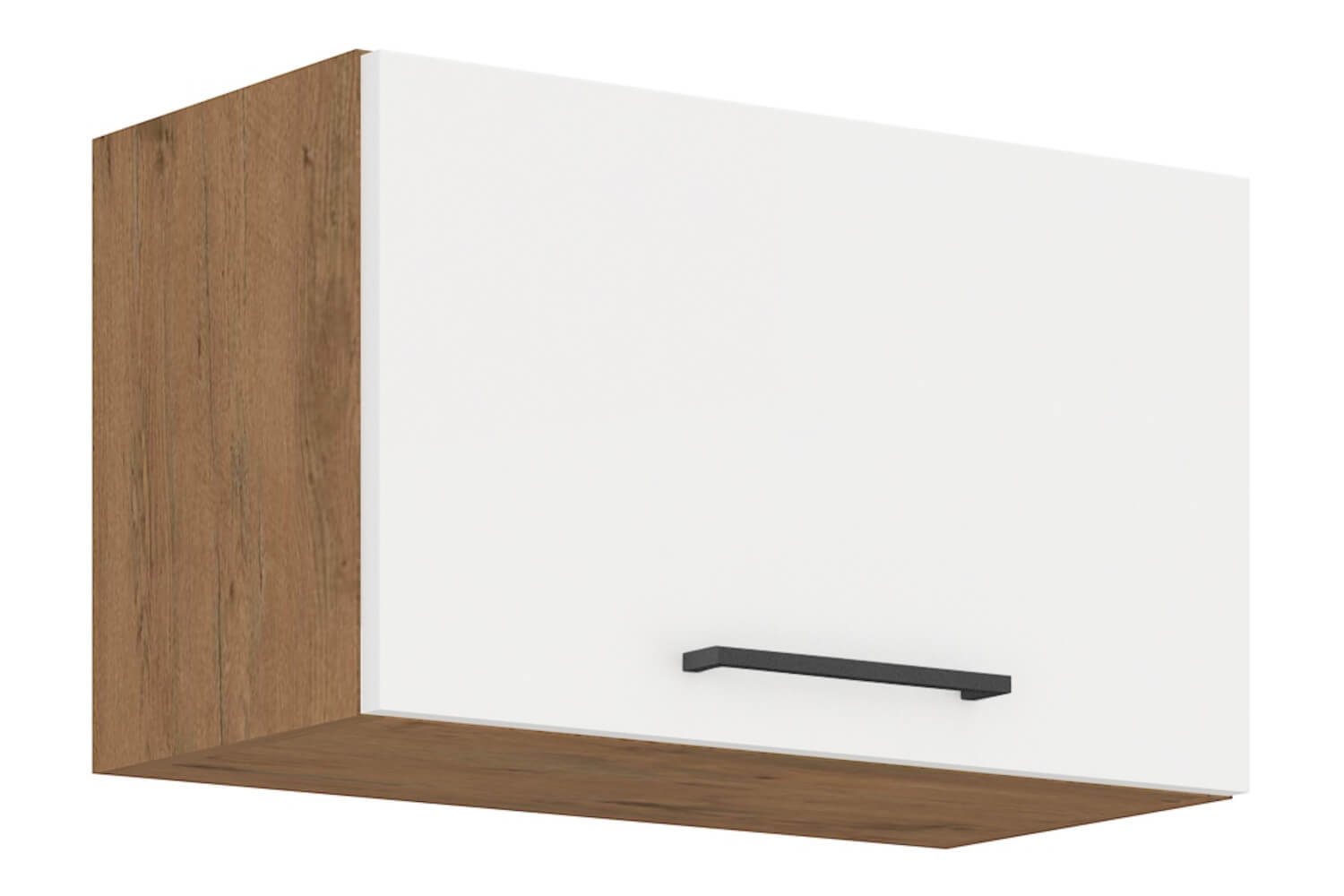 Unikalna stylistyka mebli kuchennych z kolekcji VIRGO odmieni Twoje wnętrze, wprowadzając do niego niekonwencjonalność z nutą elegancji. Fronty geometrycznych szafek są wykonane w kolorze białym z powłoką, nadającą piękny połysk. Otworzysz je za pomocą czarnych uchwytów z metalu. Korpusy poszczególnych brył zostały skonstruowane z trwałej płyty laminowanej, wybarwionej na ciepły odcień dębu lancelot. Oryginalna kuchnia VIRGO wykreuje doskonałą przestrzeń do przygotowywania oraz spożywania posiłków wraz z rodziną!