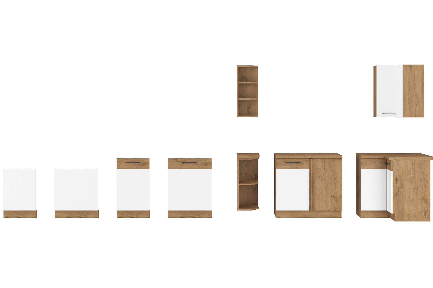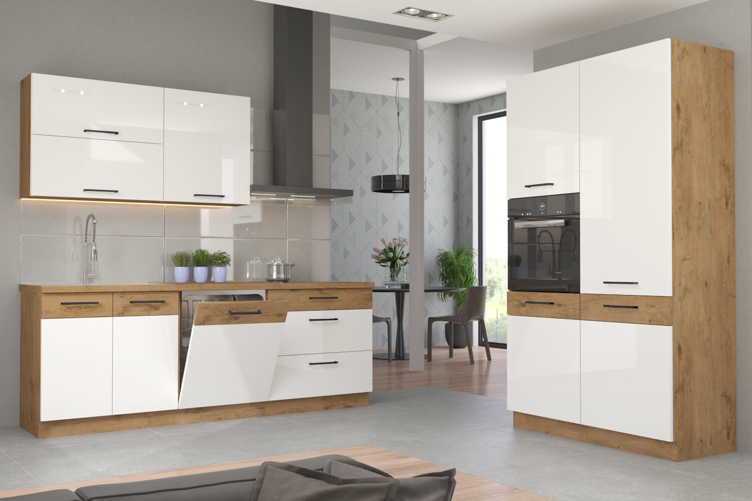 Unikalna stylistyka mebli kuchennych z kolekcji VIRGO odmieni Twoje wnętrze, wprowadzając do niego niekonwencjonalność z nutą elegancji. Fronty geometrycznych szafek są wykonane w kolorze białym z powłoką, nadającą piękny połysk. Otworzysz je za pomocą czarych uchwytów z metalu. Korpusy poszczególnych brył zostały skonstruowane z trwałej płyty laminowanej, wybarwionej na ciepły odcień dębu lancelot. Oryginalna kuchnia VIRGO wykreuje doskonałą przestrzeń do przygotowywania oraz spożywania posiłków wraz z rodziną!