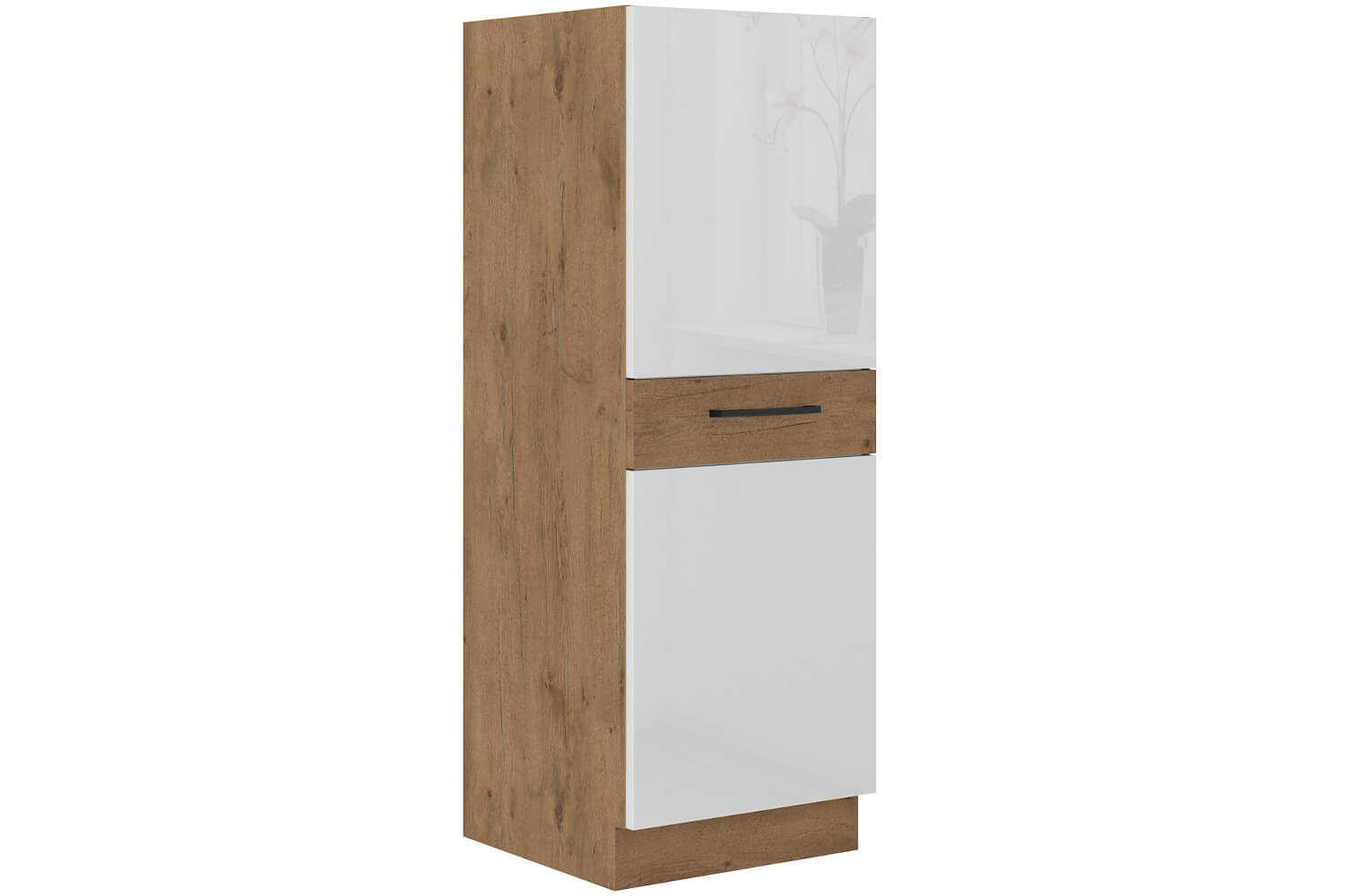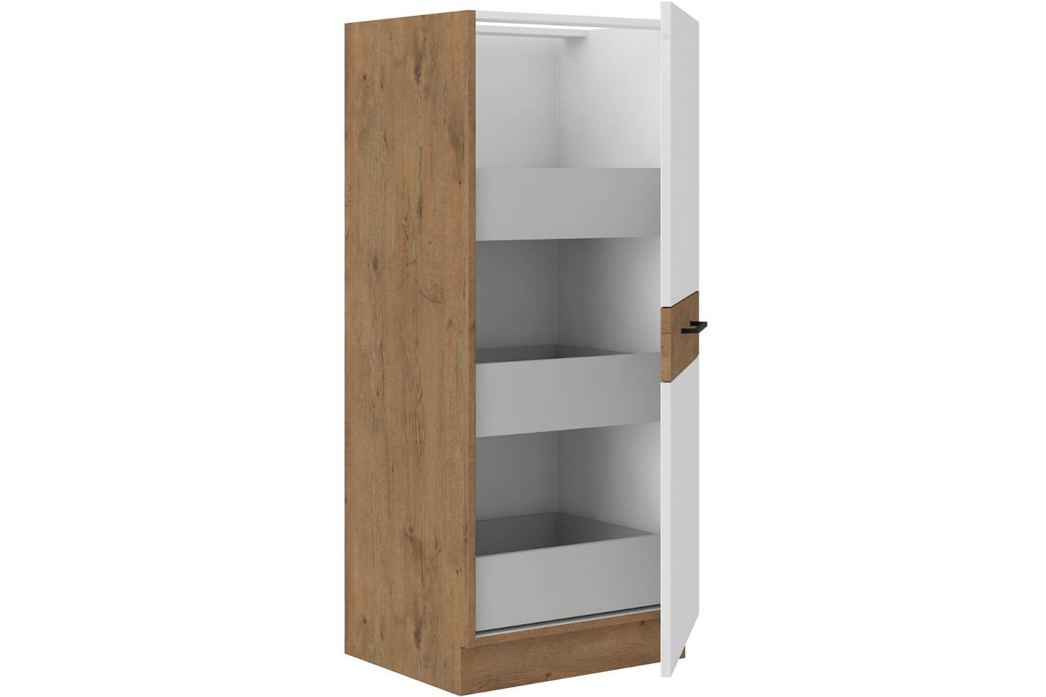 Unikalna stylistyka mebli kuchennych z kolekcji VIRGO odmieni Twoje wnętrze, wprowadzając do niego niekonwencjonalność z nutą elegancji. Fronty geometrycznych szafek są wykonane w kolorze białym z powłoką, nadającą piękny połysk. Otworzysz je za pomocą czarnych uchwytów z matalu. Korpusy poszczególnych brył zostały skonstruowane z trwałej płyty laminowanej, wybarwionej na ciepły odcień dębu lancelot. Oryginalna kuchnia VIRGO wykreuje doskonałą przestrzeń do przygotowywania oraz spożywania posiłków wraz z rodziną!
