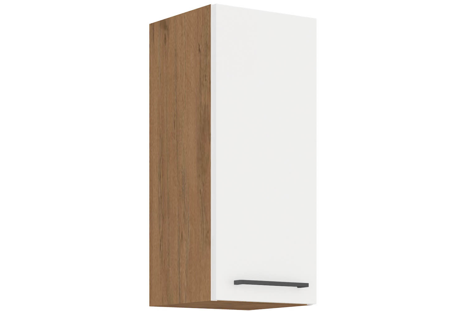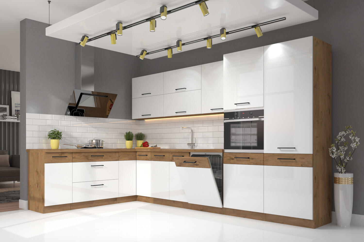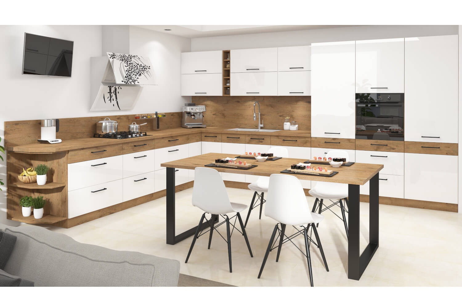 Unikalna stylistyka mebli kuchennych z kolekcji VIRGO odmieni Twoje wnętrze, wprowadzając do niego niekonwencjonalność z nutą elegancji. Fronty geometrycznych szafek są wykonane w kolorze białym z powłoką, nadającą piękny połysk. Otworzysz je za pomocą czarnych uchwytów z metalu. Korpusy poszczególnych brył zostały skonstruowane z trwałej płyty laminowanej, wybarwionej na ciepły odcień dębu lancelot. Oryginalna kuchnia VIRGO wykreuje doskonałą przestrzeń do przygotowywania oraz spożywania posiłków wraz z rodziną!
