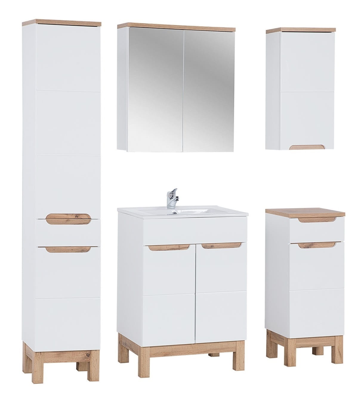 Kolekcja mebli łazienkowych BALI WHITE dzięki uniwersalnemu połączeniu matowej bieli na korpusach, połysku na frontach i jasnego drewna we wstawkach idealnie dopasuje się do każdej najmodniejszej strefy kąpielowej. Przy jasnej glazurze imitujące drewno elementy wzbogacą wnętrze i będą traktowane jako dodatkowa dekoracja. Kiedy płytki w łazience będą ciemniejsze, białe meble rozświetlą przestrzeń. Najwyższą jakość wykonania gwarantuje płyta meblowa laminowana o grubości 16 mm na korpusach oraz fronty wykonane z MDF. Duża ilość brył pozwoli każdemu amatorowi oraz profesjonaliście w dziedzinie architektury wnętrz dowolnie zaaranżować łazienkę według potrzeb użytkownika.