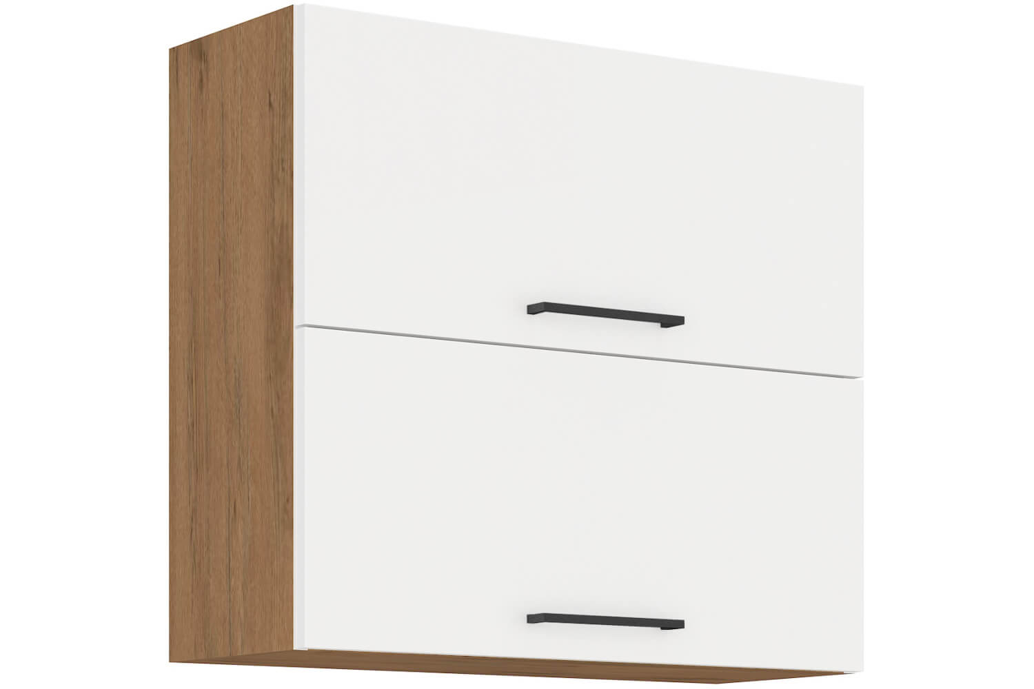Unikalna stylistyka mebli kuchennych z kolekcji VIRGO odmieni Twoje wnętrze, wprowadzając do niego niekonwencjonalność z nutą elegancji. Fronty geometrycznych szafek są wykonane w kolorze białym z powłoką, nadającą piękny połysk. Otworzysz je za pomocą czarnych uchwytów z metalu. Korpusy poszczególnych brył zostały skonstruowane z trwałej płyty laminowanej, wybarwionej na ciepły odcień dębu lancelot. Oryginalna kuchnia VIRGO wykreuje doskonałą przestrzeń do przygotowywania oraz spożywania posiłków wraz z rodziną!