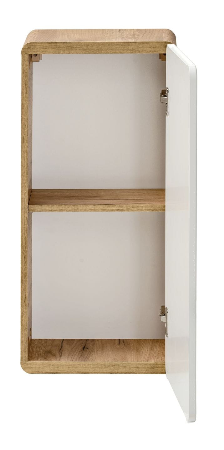 Szafka wisząca ARUBA 830 wnętrze ma podzielone półką na dwie przestrzenie. Jest idealną opcją do zagospodarowania przestrzeni na ścianie w niewielkich łazienkach, zapewni zamknięte miejsce na przechowywanie akcesoriów łazienkowych, czy środków czystości.