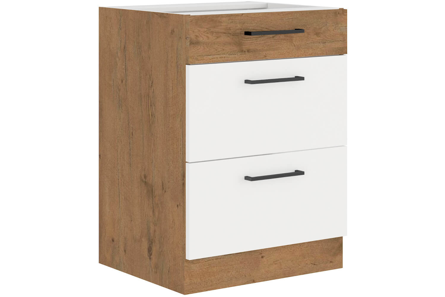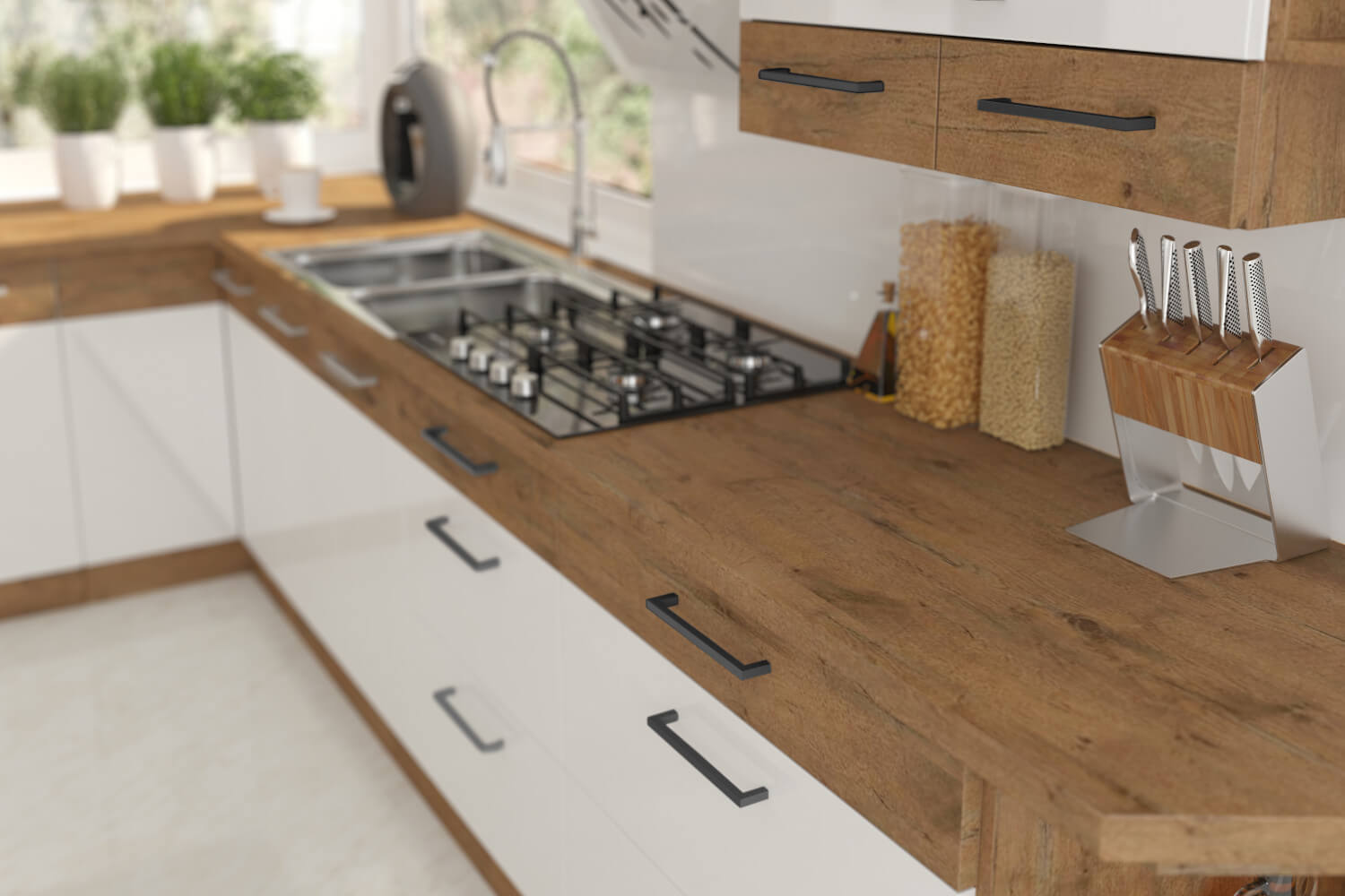 Unikalna stylistyka mebli kuchennych z kolekcji VIRGO odmieni Twoje wnętrze, wprowadzając do niego niekonwencjonalność z nutą elegancji. Fronty geometrycznych szafek są wykonane w kolorze białym z powłoką, nadającą piękny połysk. Otworzysz je za pomocą czarnych uchwytów z metalu. Korpusy poszczególnych brył zostały skonstruowane z trwałej płyty laminowanej, wybarwionej na ciepły odcień dębu lancelot. Oryginalna kuchnia VIRGO wykreuje doskonałą przestrzeń do przygotowywania oraz spożywania posiłków wraz z rodziną!
