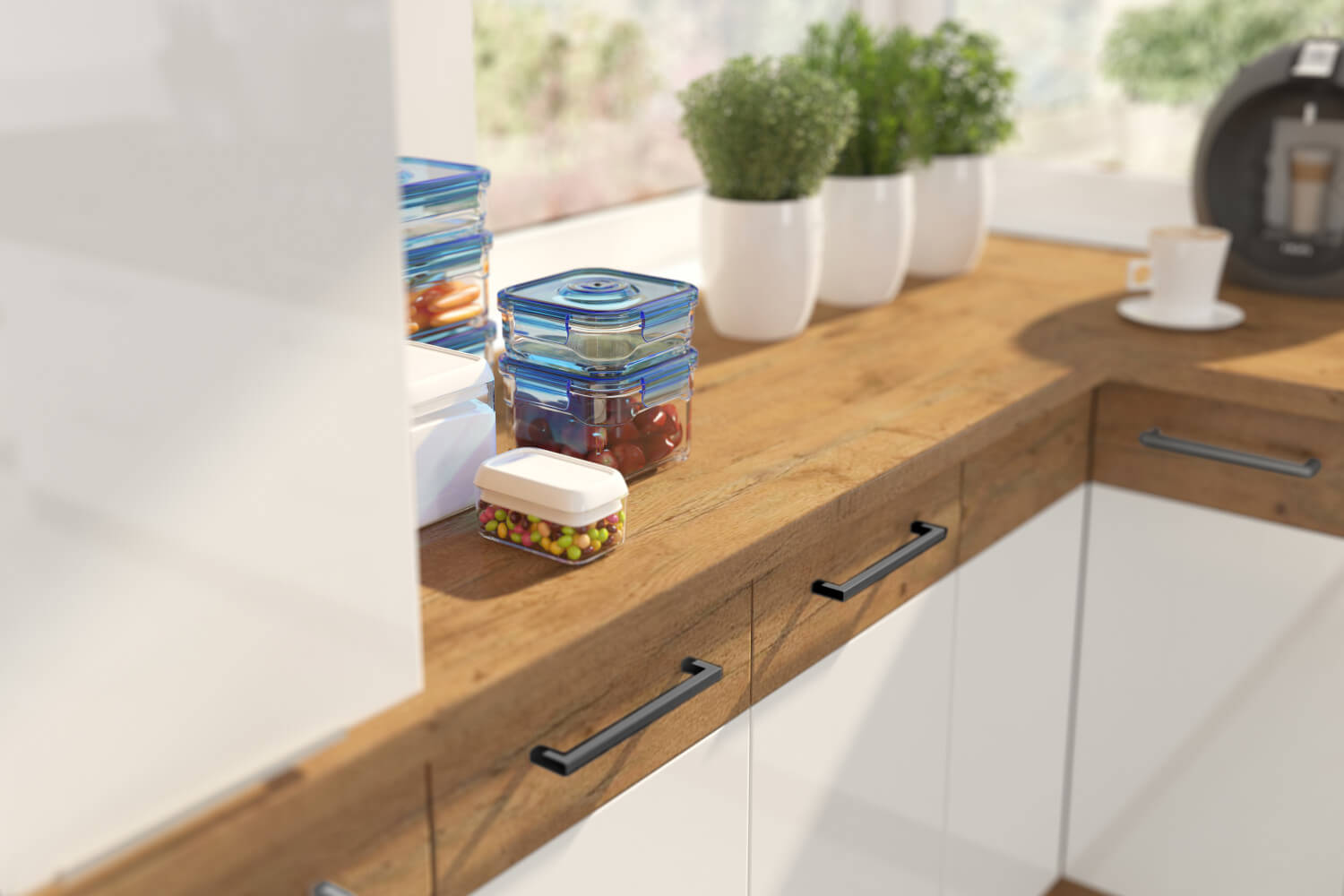 Unikalna stylistyka mebli kuchennych z kolekcji VIRGO odmieni Twoje wnętrze, wprowadzając do niego niekonwencjonalność z nutą elegancji. Fronty geometrycznych szafek są wykonane w kolorze białym z powłoką, nadającą piękny połysk. Otworzysz je za pomocą czarnych uchwytów z metalu. Korpusy poszczególnych brył zostały skonstruowane z trwałej płyty laminowanej, wybarwionej na ciepły odcień dębu lancelot. Oryginalna kuchnia VIRGO wykreuje doskonałą przestrzeń do przygotowywania oraz spożywania posiłków wraz z rodziną!