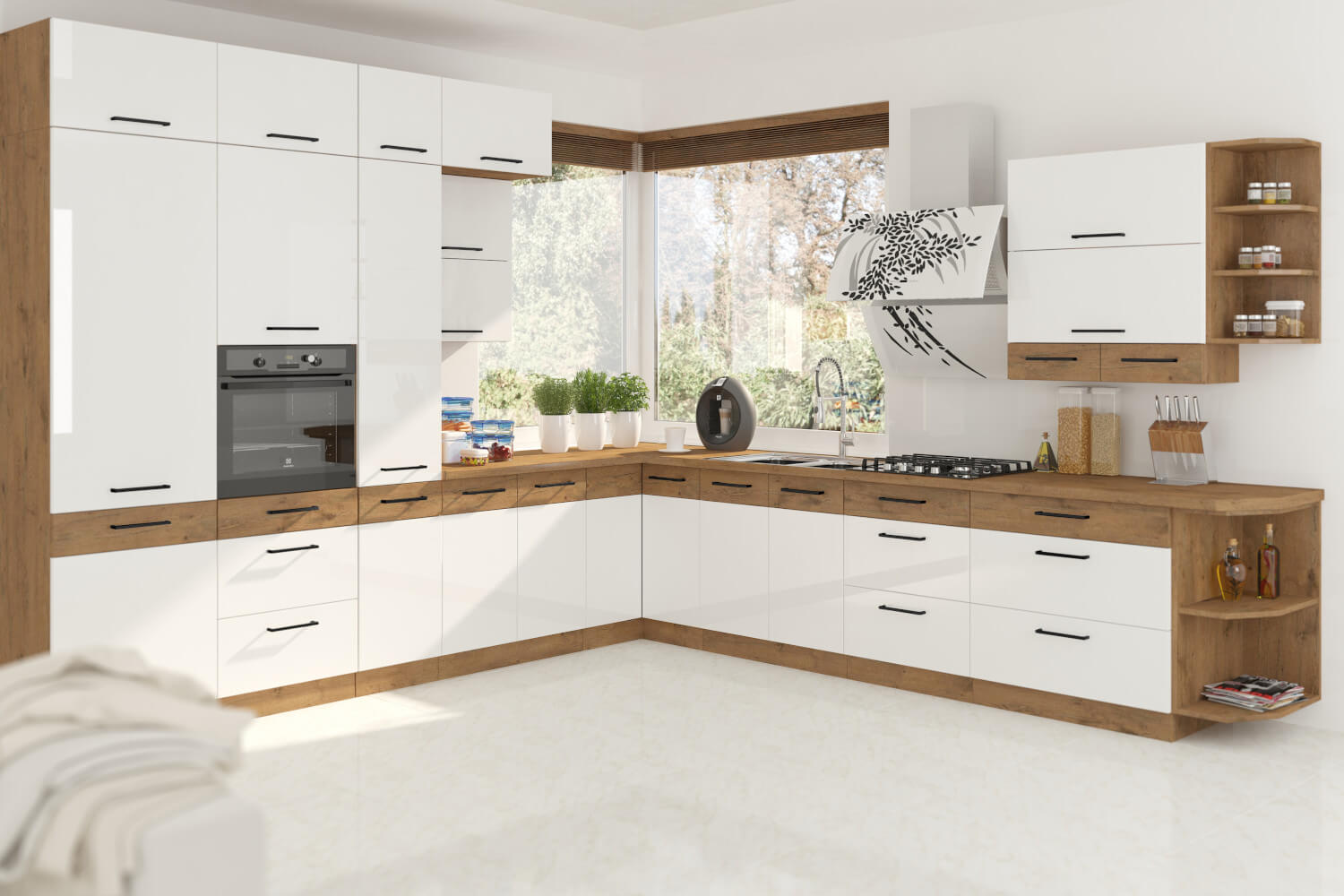 Unikalna stylistyka mebli kuchennych z kolekcji VIRGO odmieni Twoje wnętrze, wprowadzając do niego niekonwencjonalność z nutą elegancji. Fronty geometrycznych szafek są wykonane w kolorze białym z powłoką, nadającą piękny połysk. Otworzysz je za pomocą czarnych uchwytów z metalu. Korpusy poszczególnych brył zostały skonstruowane z trwałej płyty laminowanej, wybarwionej na ciepły odcień dębu lancelot. Oryginalna kuchnia VIRGO wykreuje doskonałą przestrzeń do przygotowywania oraz spożywania posiłków wraz z rodziną!