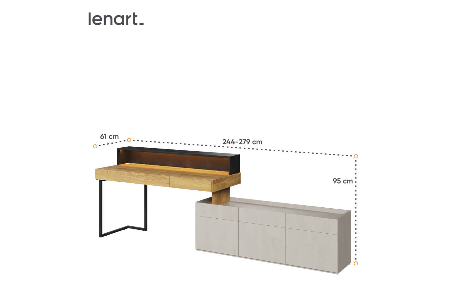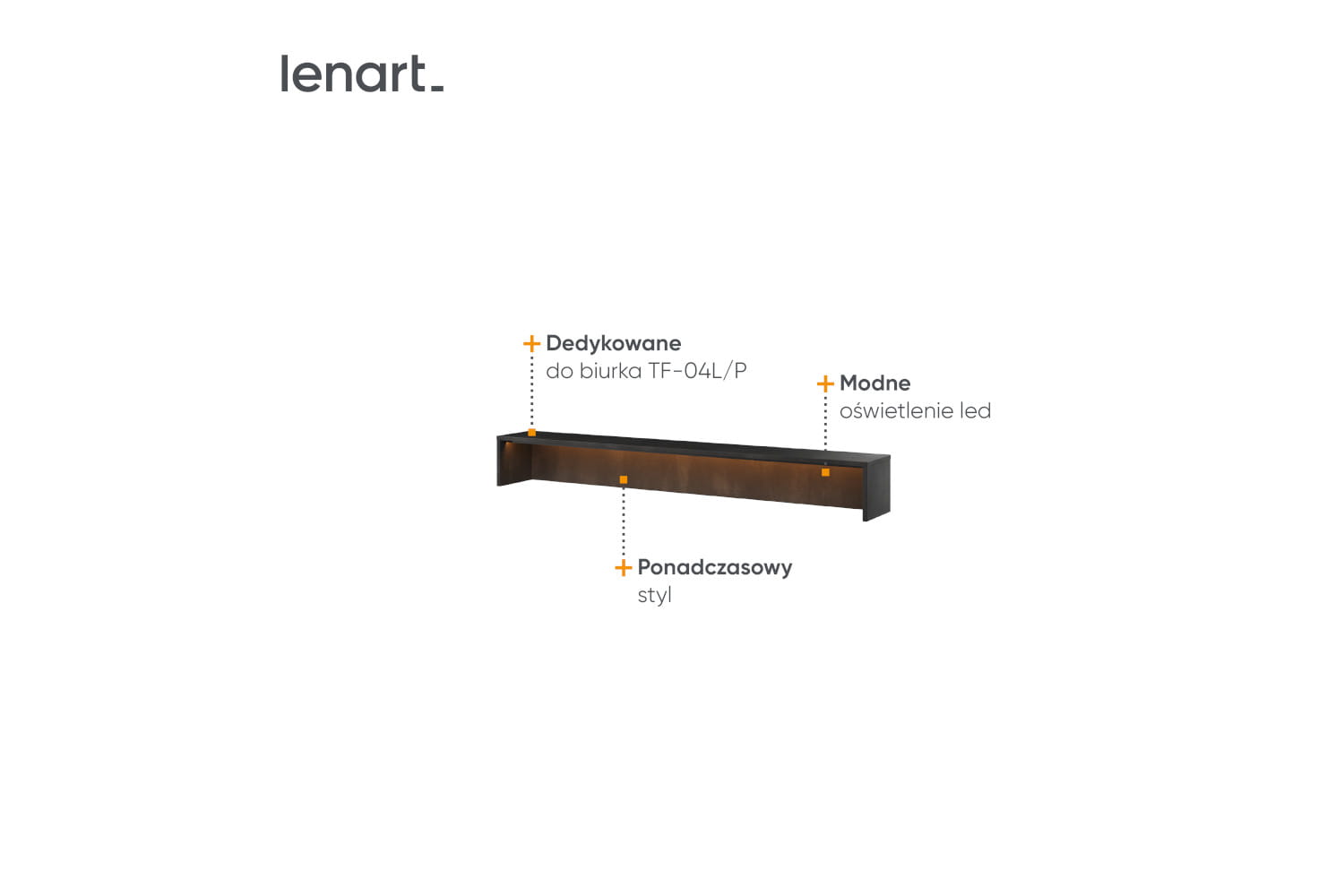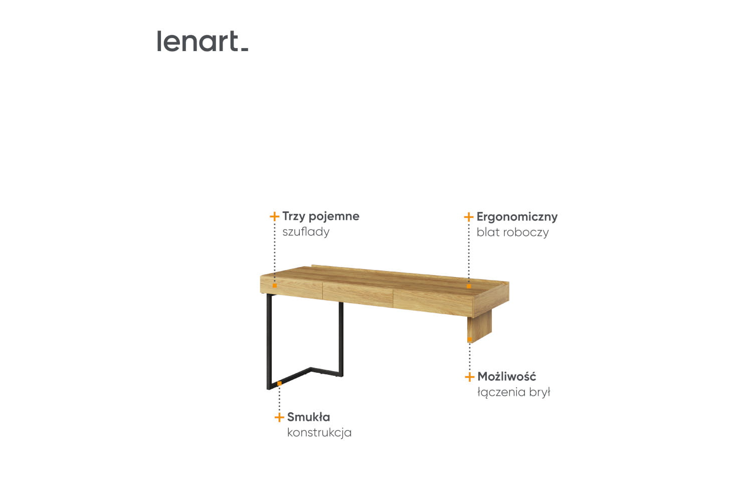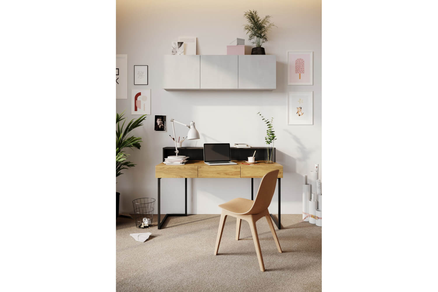 Biurko zostało zaprojektowane tak, aby zapewnić wygodne miejsce do pracy i przechowywania. Metalowa nóżka zapewni stabilność i trwałość, gwarantując solidne podparcie dla całej konstrukcji. Szafka z trzema półkami zapewni dodatkową przestrzeń do składania dokumentów, książek, akcesoriów biurowych i innych niezbędnych przedmiotów. Nadstawka z oświetleniem LED w kolorze pomarańczowym stworzy przyjemną atmosferę sprzyjającą nauce.