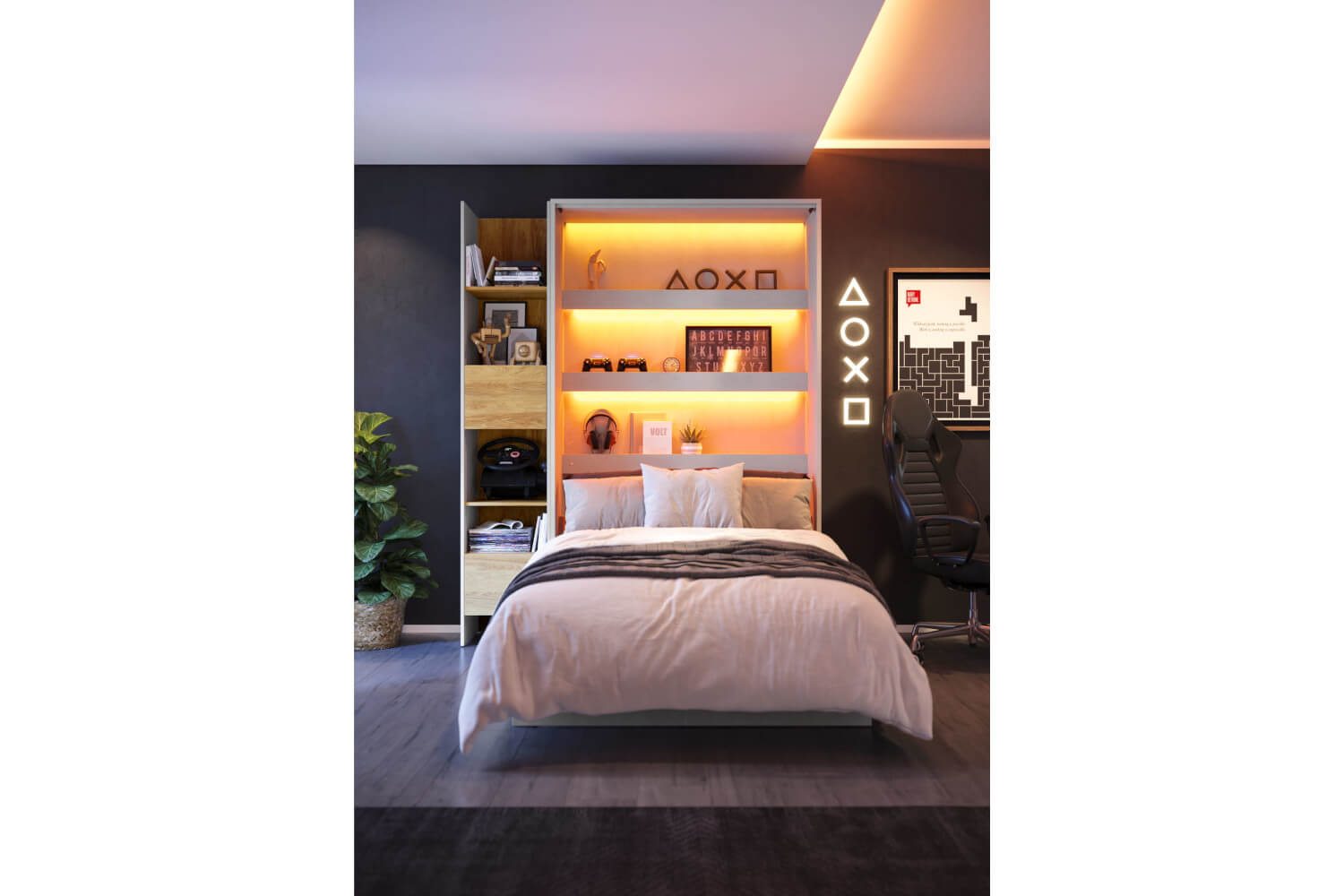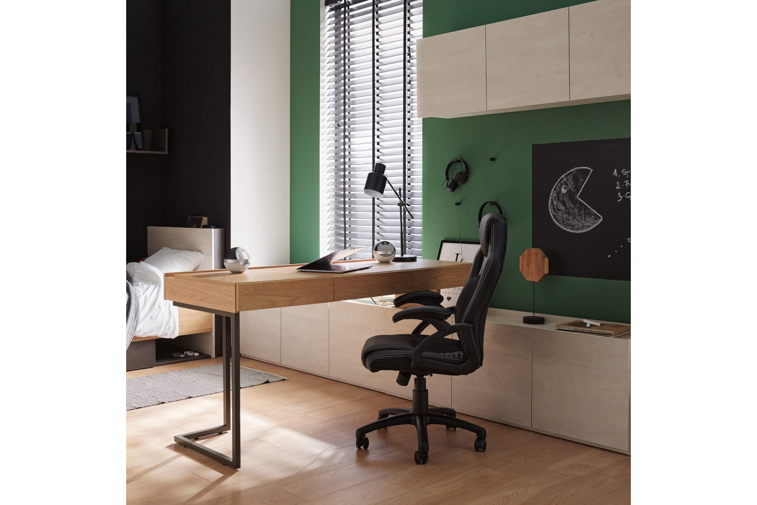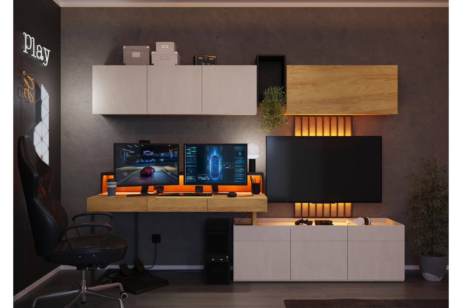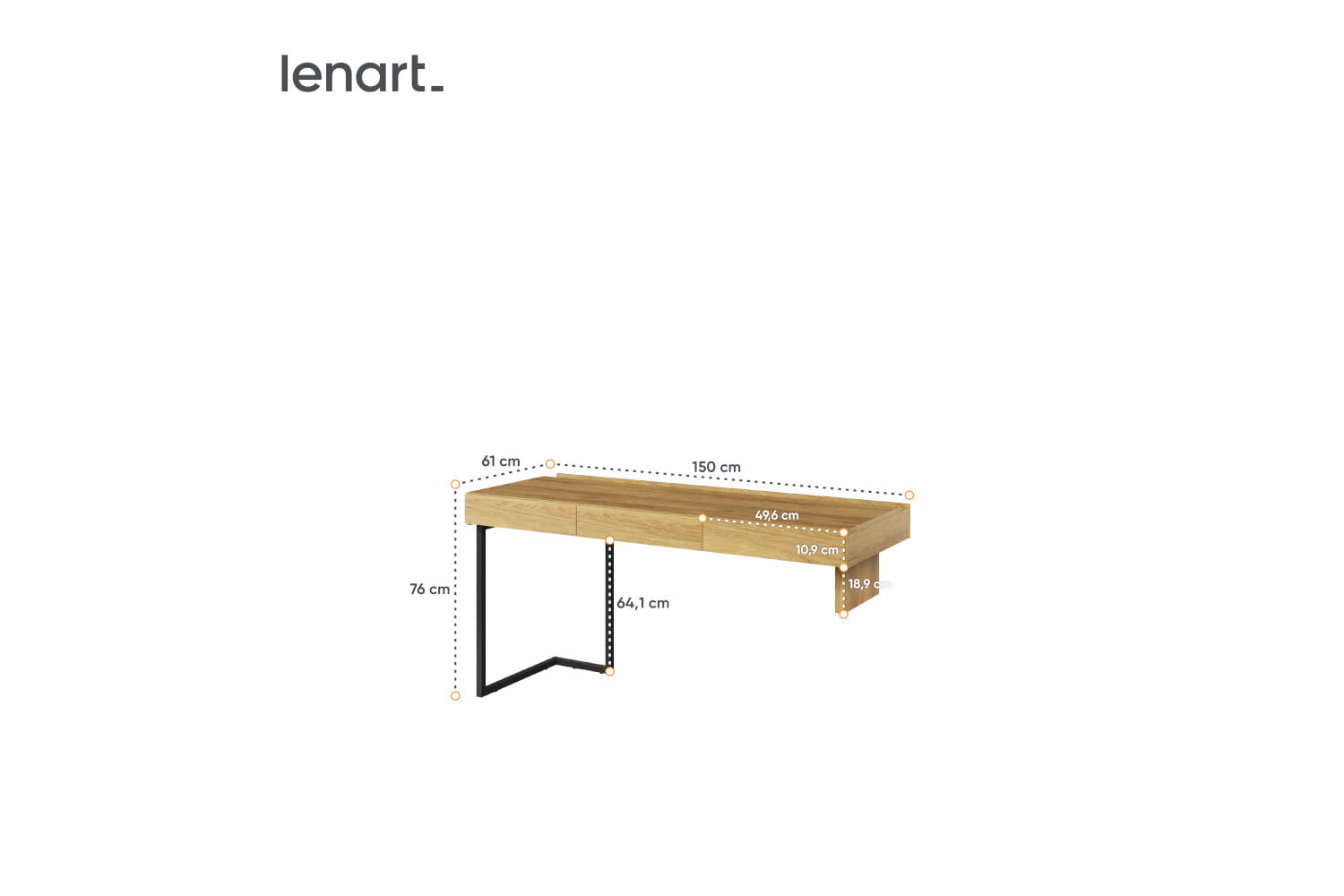 Biurko zostało zaprojektowane tak, aby zapewnić wygodne miejsce do pracy i przechowywania. Metalowa nóżka zapewni stabilność i trwałość, gwarantując solidne podparcie dla całej konstrukcji. Szafka z trzema półkami zapewni dodatkową przestrzeń do składania dokumentów, książek, akcesoriów biurowych i innych niezbędnych przedmiotów. Nadstawka z oświetleniem LED w kolorze pomarańczowym stworzy przyjemną atmosferę sprzyjającą nauce.