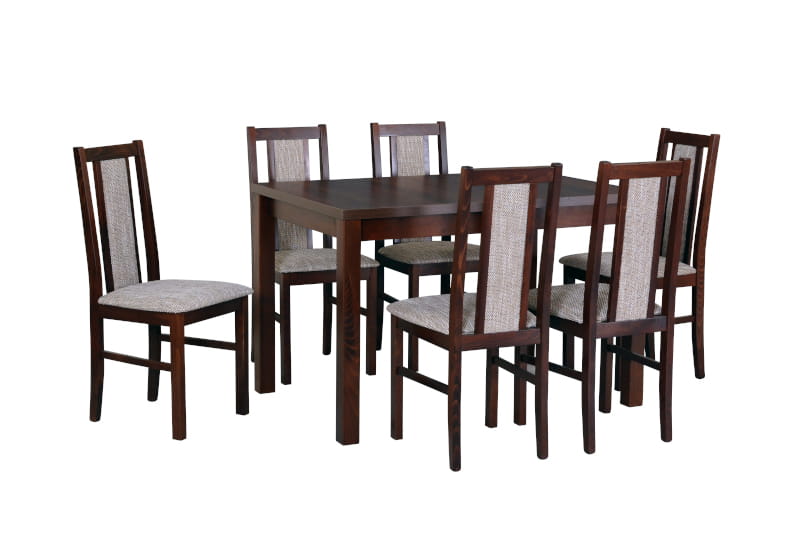 Komplet mebli jadalnianych składający się ze stołu VAX 5 oraz sześć krzeseł COSS 14. Idealny zarówno do klasycznej kuchni jak i stylowej jadalni. Oskrzynie i nogi w stołach oraz krzesła produkowane są z litego drewna bukowego natomiast blat stanowi wysokogatunkowa płyta wykończona okleiną.