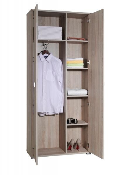 Zestaw do przedpokoju NANTER S2P to meble przeznaczone głównie dla wąskich pomieszczeń, które również potrzebują zagospodarowania. Jednym z nich może być właśnie przedpokój, gdzie mimo małej przestrzeni chcielibyśmy schować kurtki, które może nie wyglądają zbyt estetycznie na ściennych wieszakach oraz buty, które niepotrzebnie zagracają wejście. Niewątpliwym atutem szafy są półki gdzie swoje miejsce znajdą rzeczy, które warto mieć pod ręką opuszczając dom lub mieszkanie, m. in. pastę do butów, klucze czy parasol. Szafka na buty może być jednocześnie podstawą dla lampki, ramki na zdjęcie lub po prostu ulubionej torebki Pani domu.