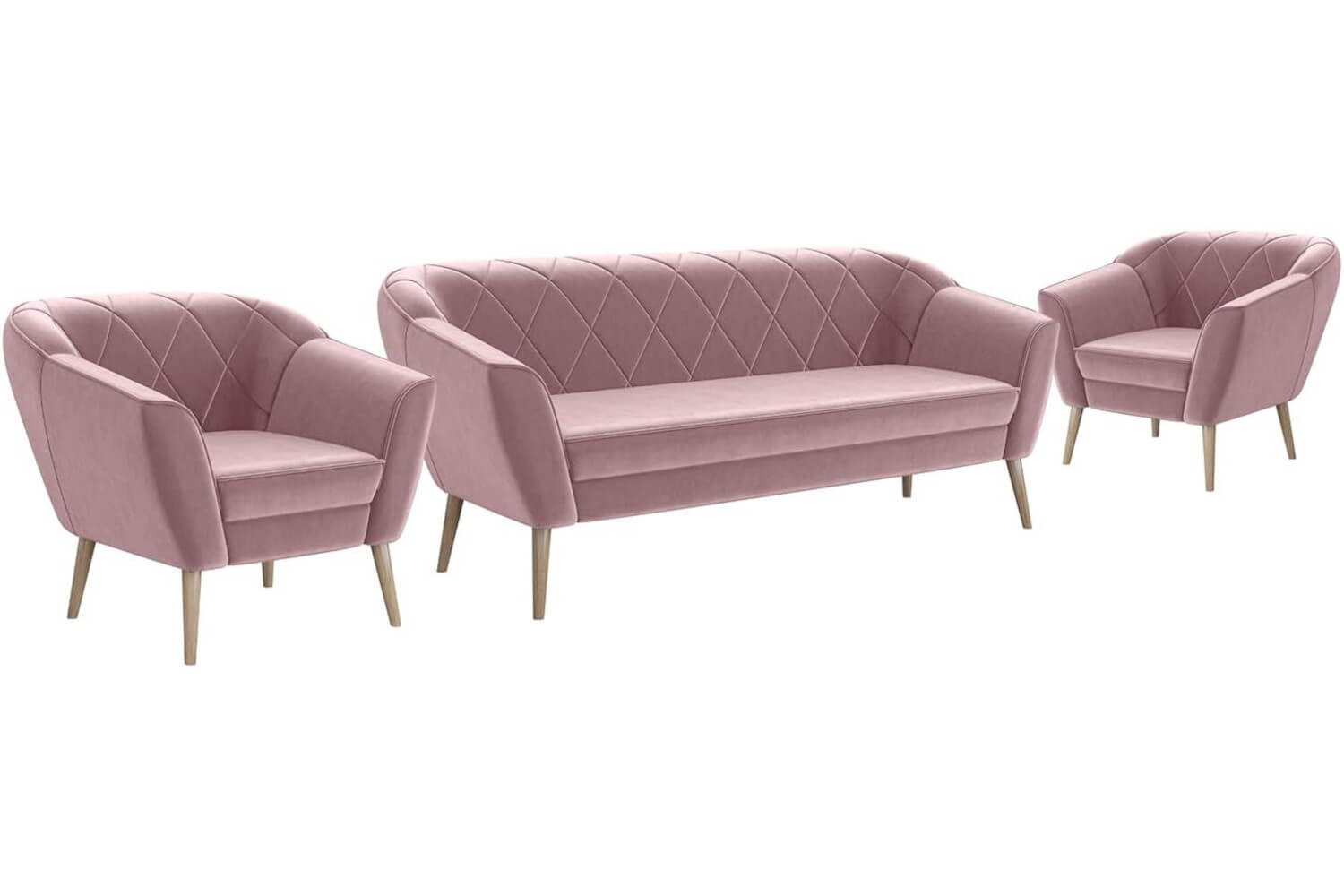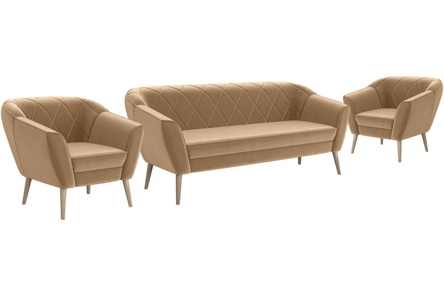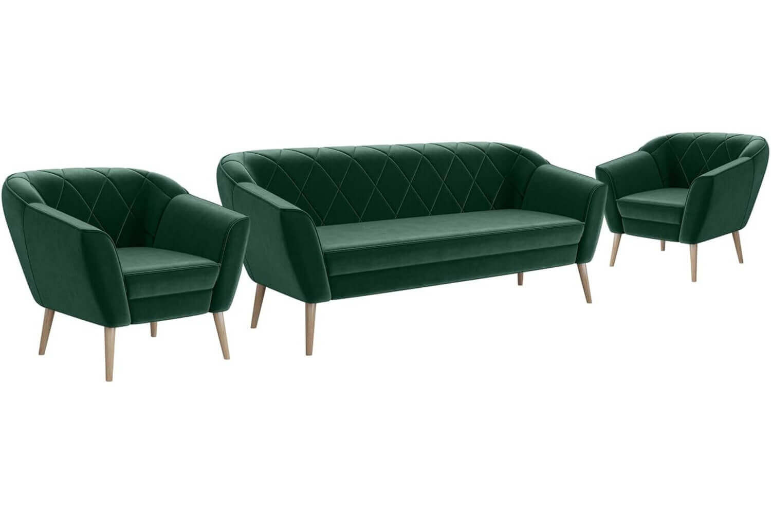 Zestaw mebli wypoczynkowych GLORI 3+1+1 łączy nowoczesny design z nutą vintage, tworząc harmonijne i stylowe wnętrze. W skład zestawu wchodzi sofa 3-osobowa o szerokości 180 cm oraz dwa fotele. Tapicerka dostępna jest w siedmiu eleganckich kolorach, które doskonale dopasują się do każdego wnętrza. Oparcie sofy i foteli zdobią delikatne przeszycia, które nadają meblom wyjątkowy charakter. Nóżki z drewna bukowego, dostępne w kilku wariantach kolorystycznych, pozwalają na personalizację i dopasowanie do pozostałych elementów wnętrza.