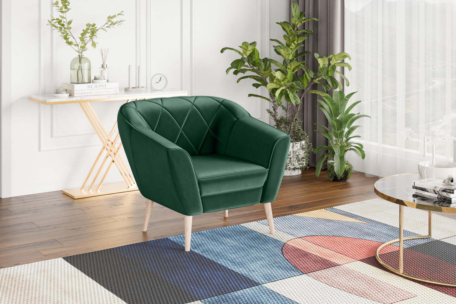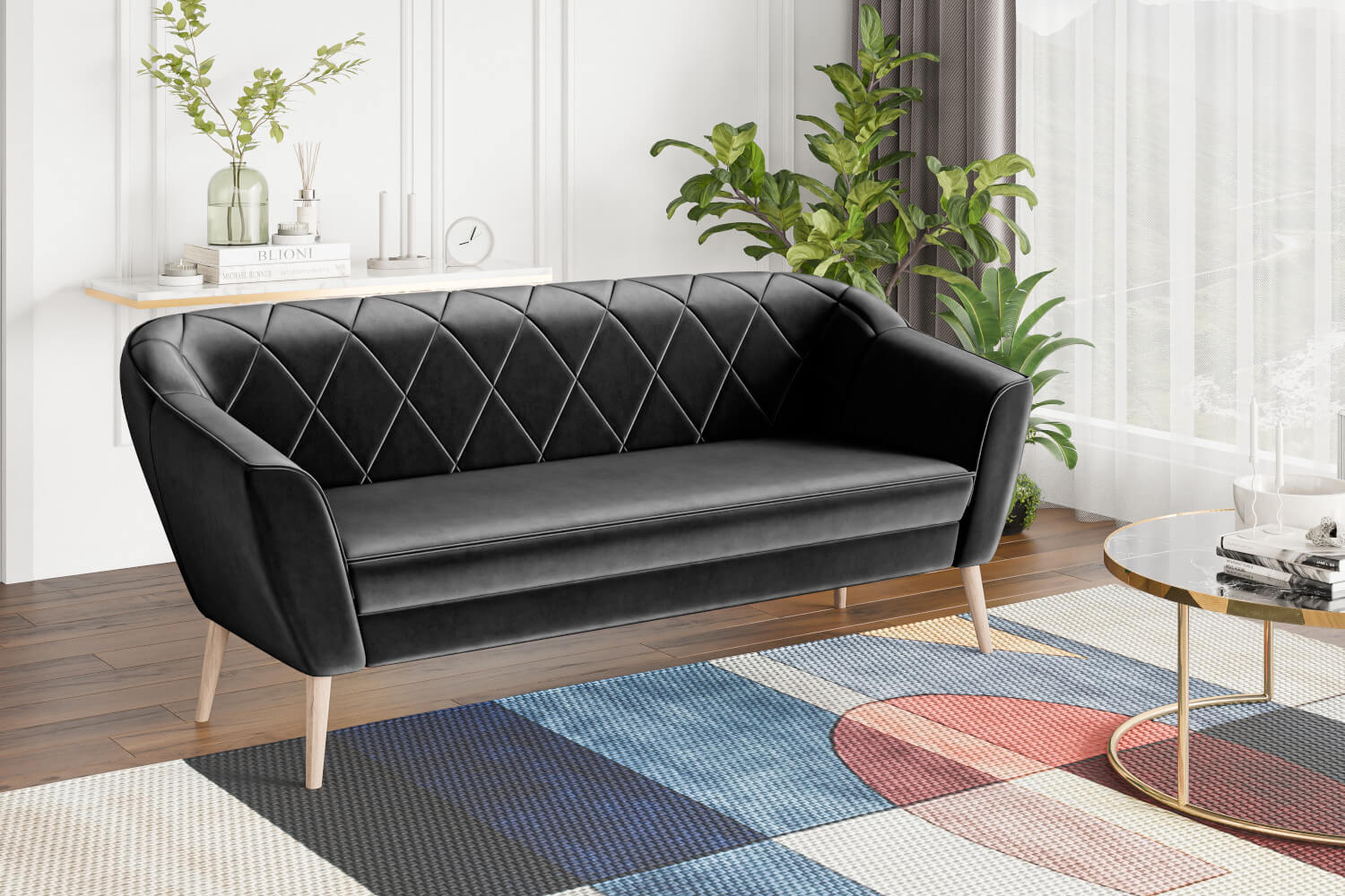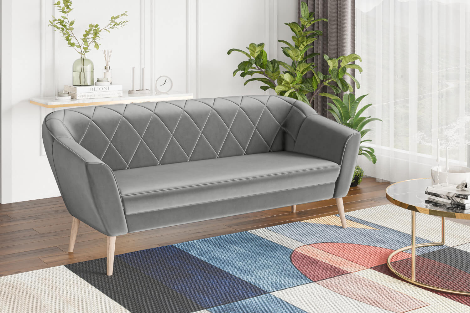 Zestaw mebli wypoczynkowych GLORI 3+1+1 łączy nowoczesny design z nutą vintage, tworząc harmonijne i stylowe wnętrze. W skład zestawu wchodzi sofa 3-osobowa o szerokości 180 cm oraz dwa fotele. Tapicerka dostępna jest w siedmiu eleganckich kolorach, które doskonale dopasują się do każdego wnętrza. Oparcie sofy i foteli zdobią delikatne przeszycia, które nadają meblom wyjątkowy charakter. Nóżki z drewna bukowego, dostępne w kilku wariantach kolorystycznych, pozwalają na personalizację i dopasowanie do pozostałych elementów wnętrza.