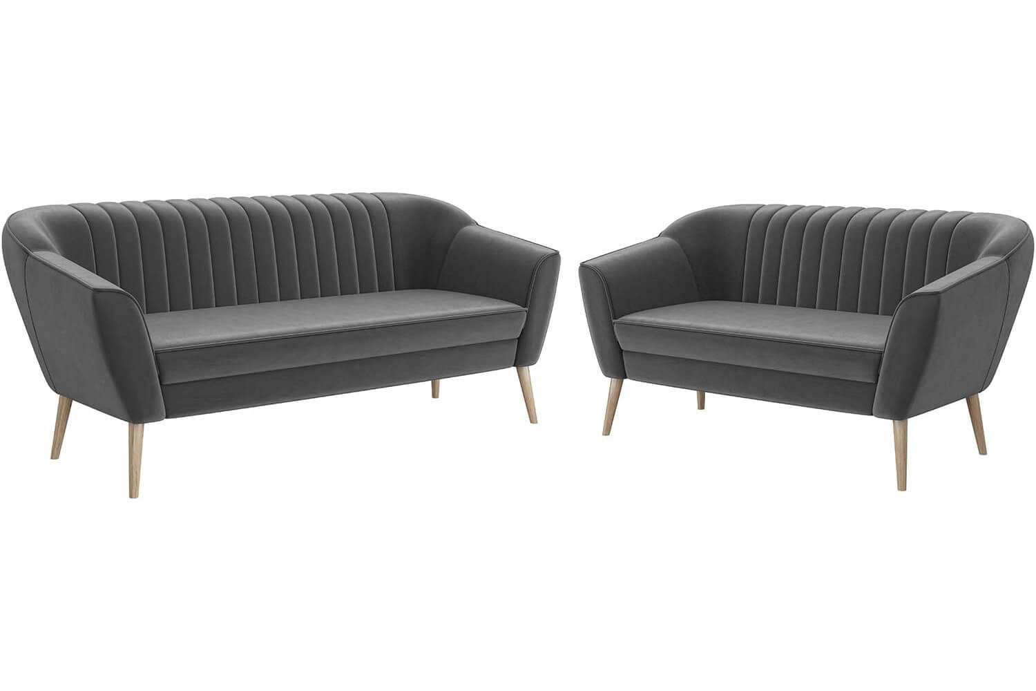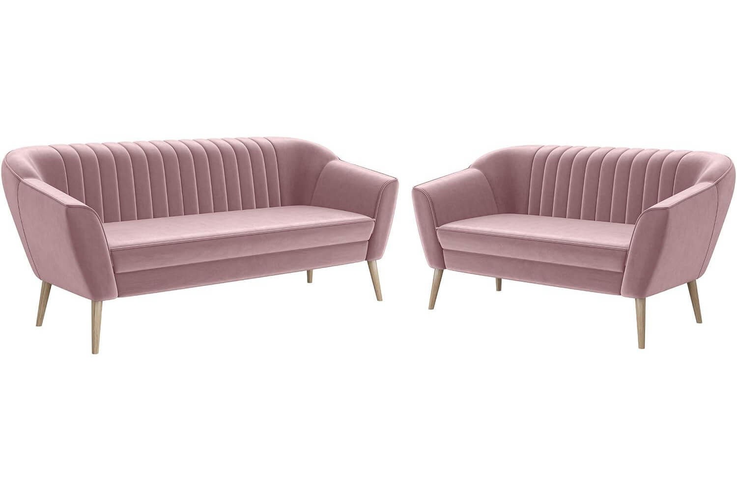 W skład zestawu wchodzi sofa 2-osobowa o szerokości 140 cm oraz sofa 3-osobowa o szerokości 180 cm, obie na drewnianych nóżkach. Dostępne są w siedmiu różnych tkaninach do wyboru. Pikowanie na oparciach dodaje meblom elegancji i charakteru. Idealne do codziennego użytku, łączą nowoczesny design z klasyczną elegancją, pasując do różnych stylów wnętrz.
