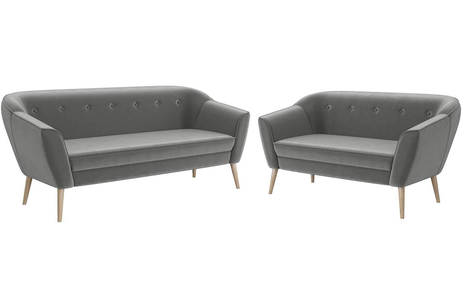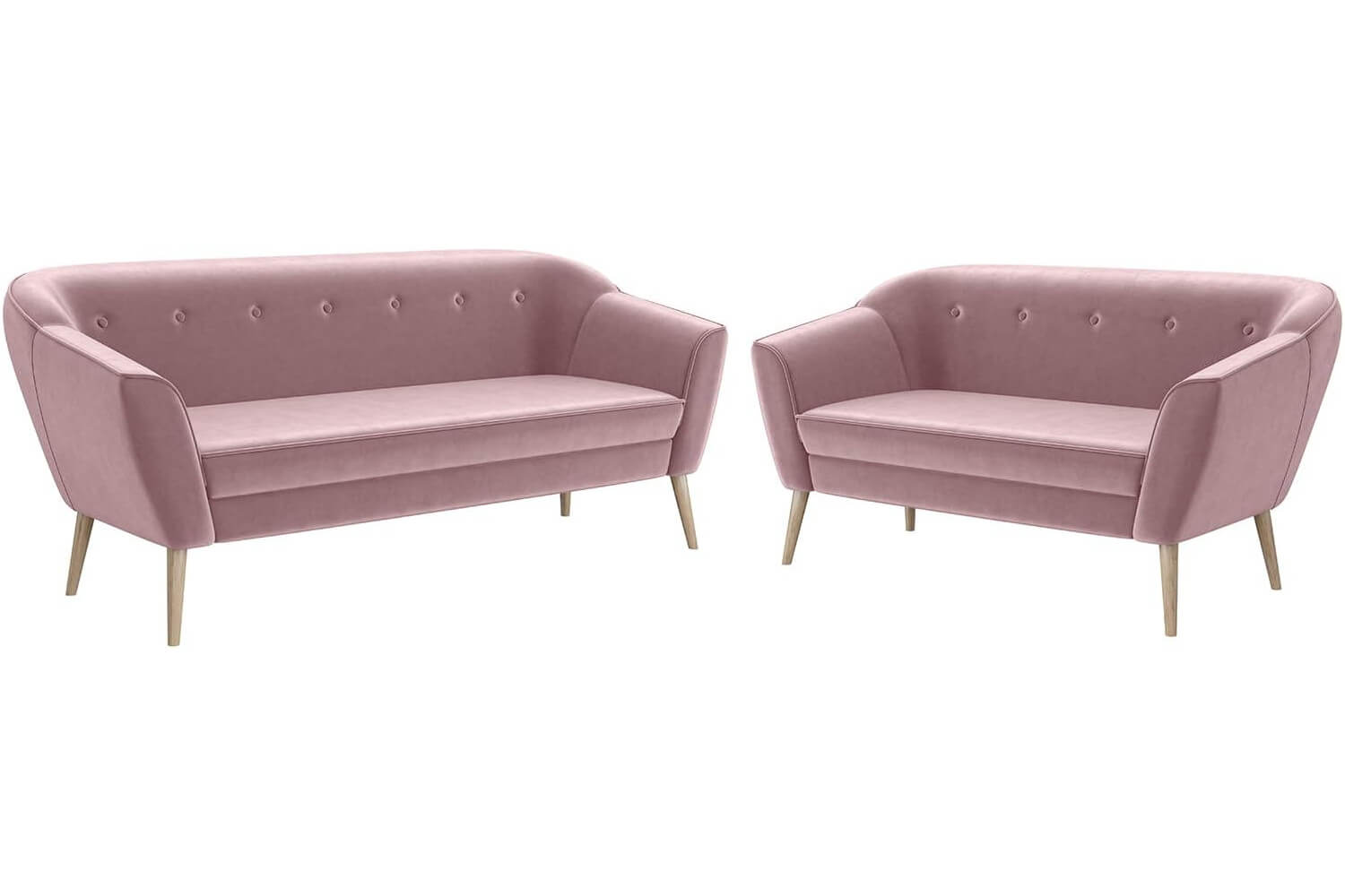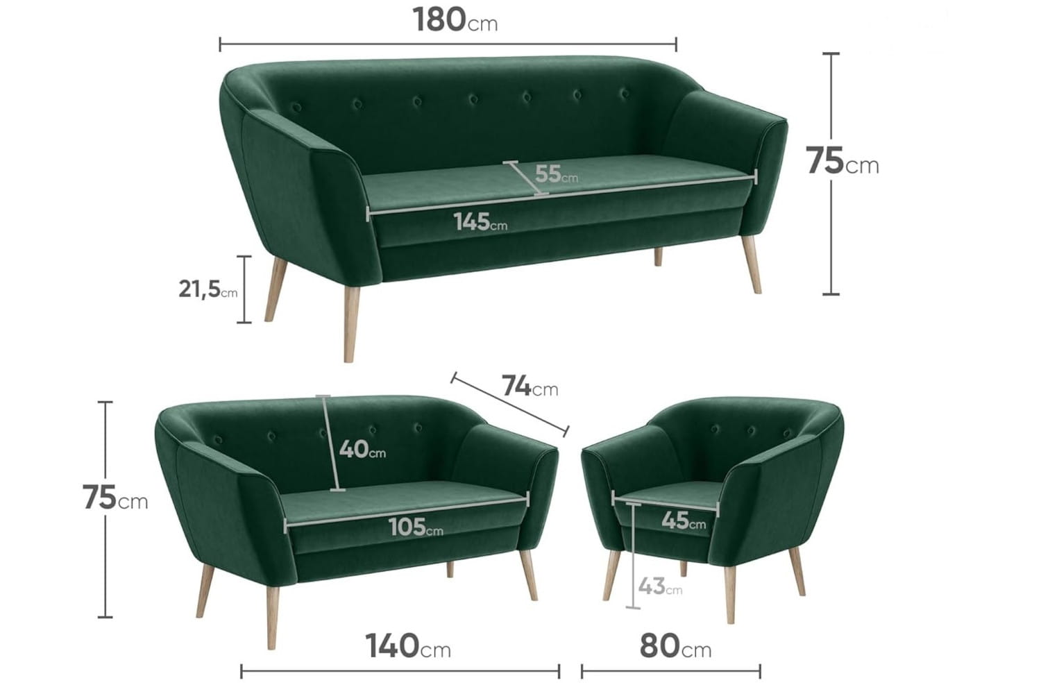 Meble wypoczynkowe DIMA wniosą do wnętrze elegancję i nowoczesny szyk. Zestaw składa się z trzyosobowej sofy o szerokości 180 cm oraz dwuosobowej o szerokości 140 cm. Oba meble wyróżniają się stylowym designem i solidną konstrukcją na drewnianych nóżkach, które dodają naturalnego uroku i stabilności.